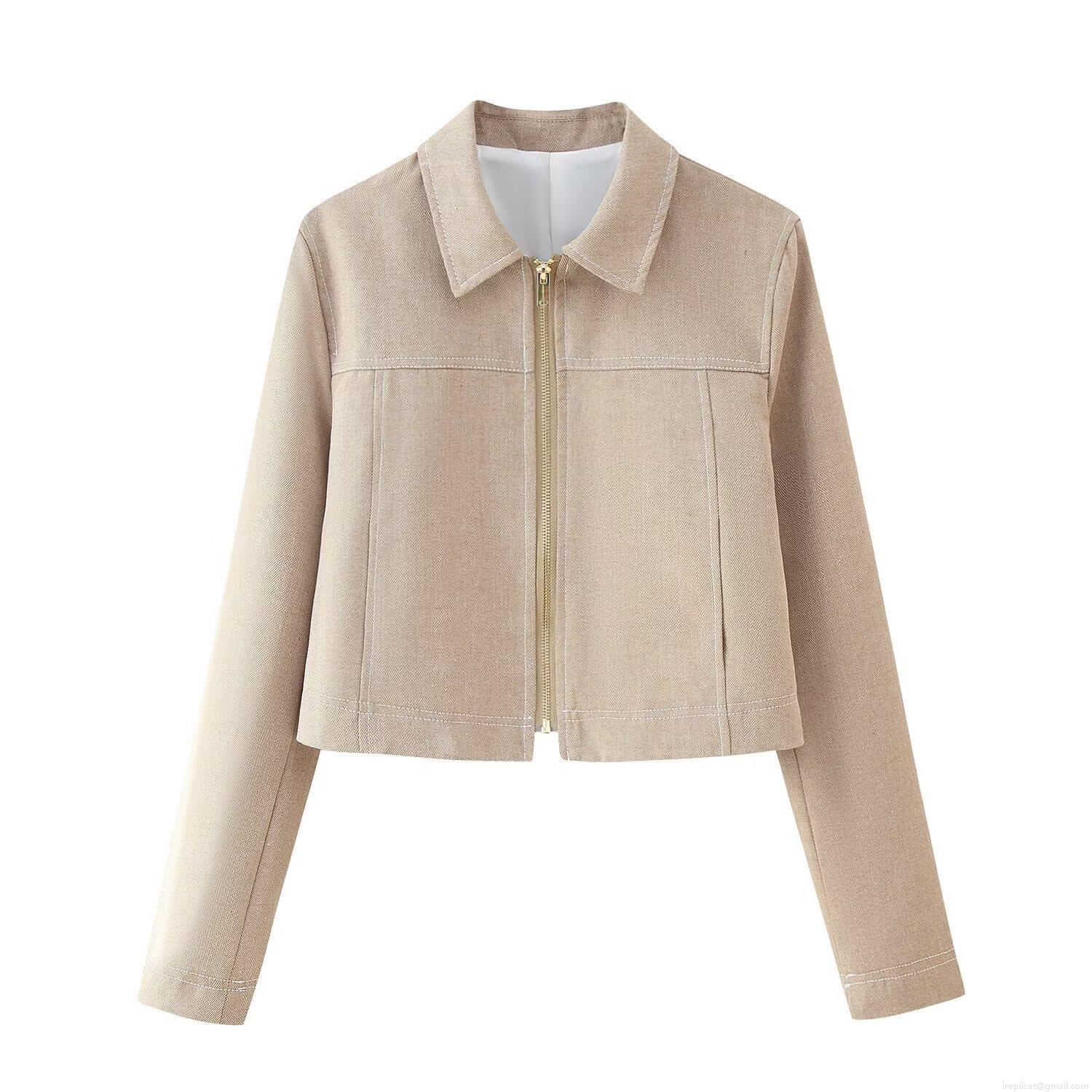 • Women's 2 Piece Outfits Herringbone Long Sleeve Lapel Zip Crop Jacket And High Waist Wide Leg Pants Set Khaki Casual Streetwear Suits