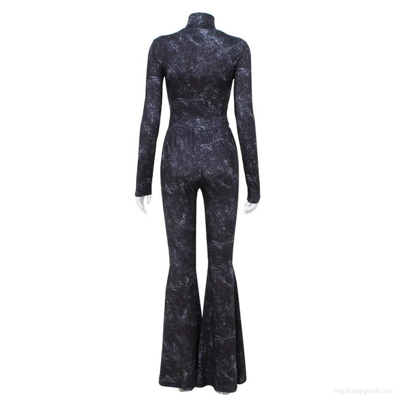 • Women's 2 Piece Outfits Sexy Acid Wash Set Front Zipper Long Sleeve Crop Top and High Waist Flare Pants Slim Fit Tracksuit Streetwear