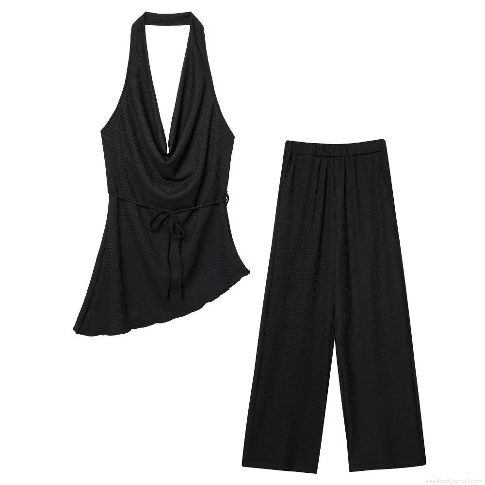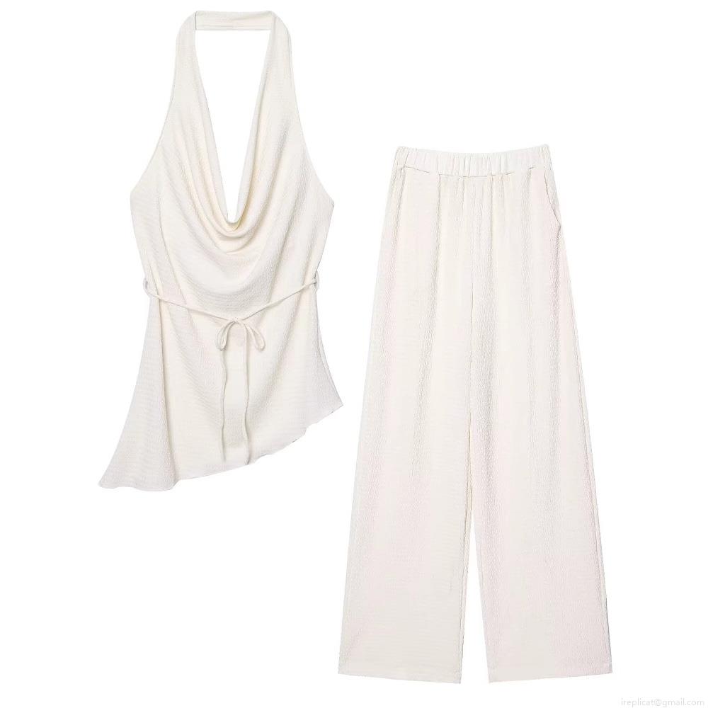 • Women's 2 Piece Outfits Sexy Halter Backless Crinkle Texture Top and High Waist Wide Leg Pants Set Solid Color Summer Streetwear Casual Co-ord Suit