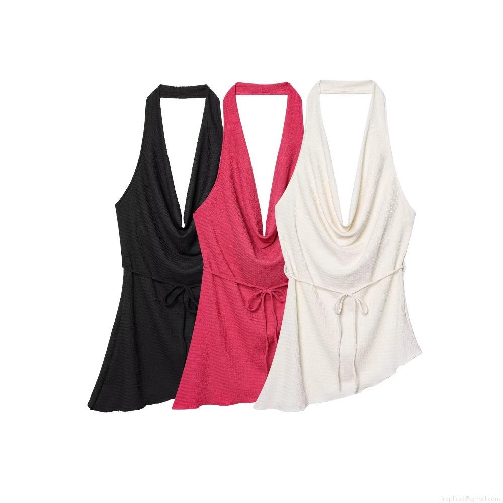 Solid Color, Textured Fabrics, Lace, Backless, Irregular Hem, Wide-leg, Neckband Design