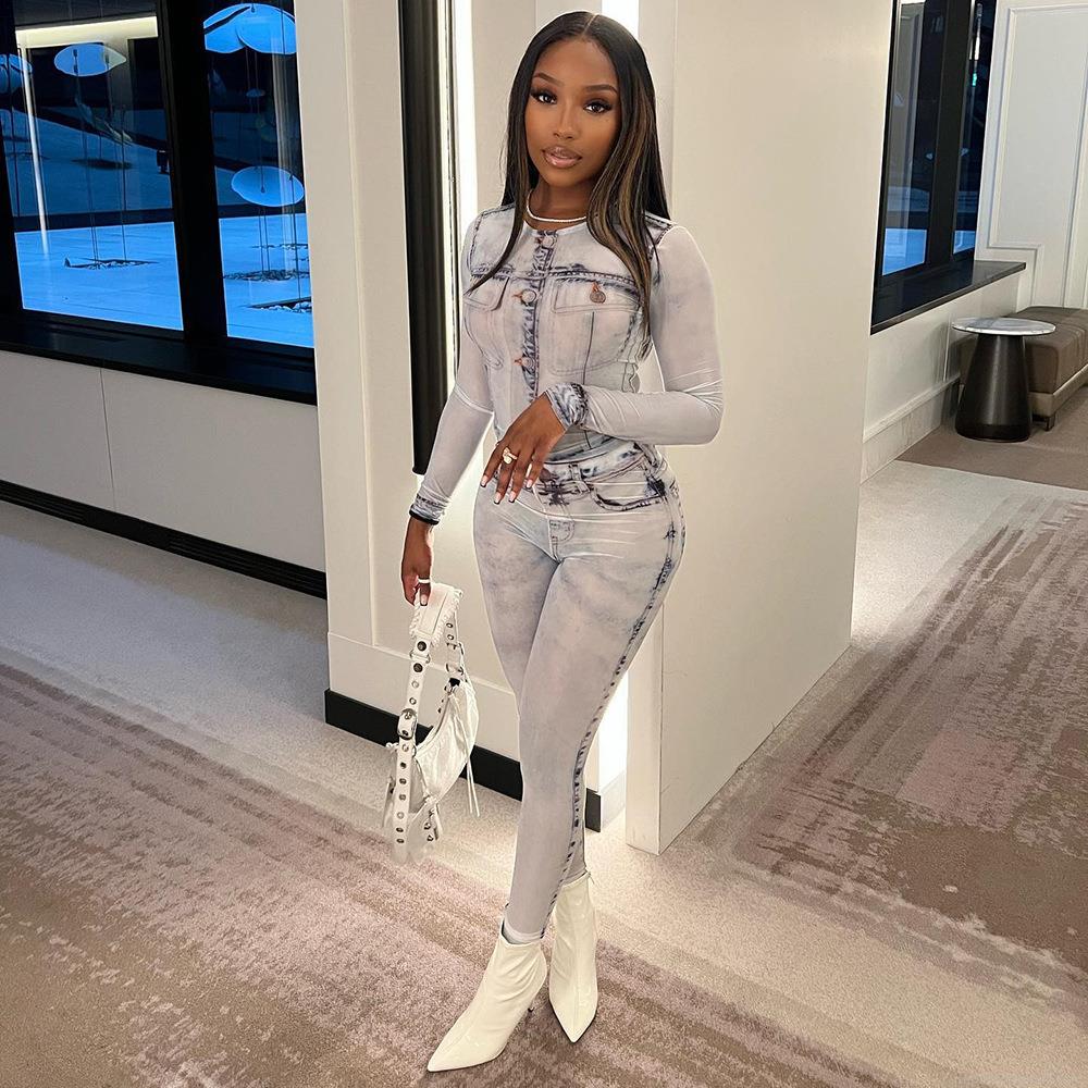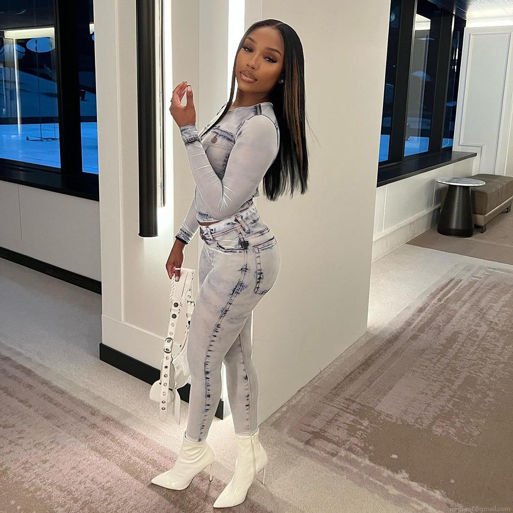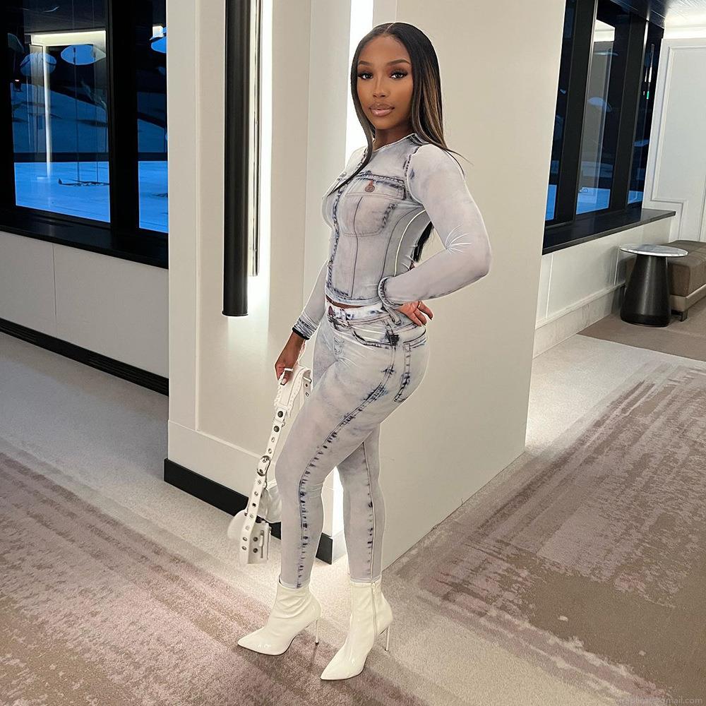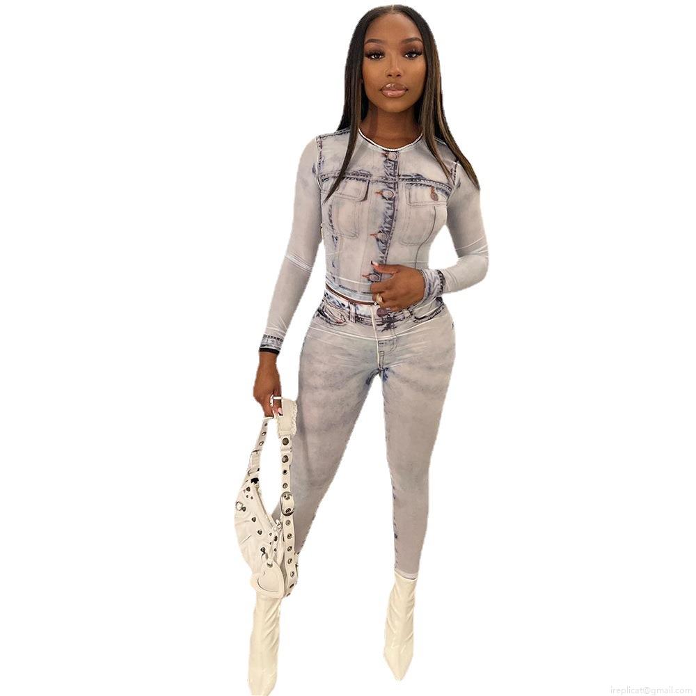 Women's 2 Piece Outfits Slim Fit Denim Texture Print Long Sleeve Crop Top And High Waist Bodycon Pants Set Streetwear Fashion Casual Polyester Suit For Women