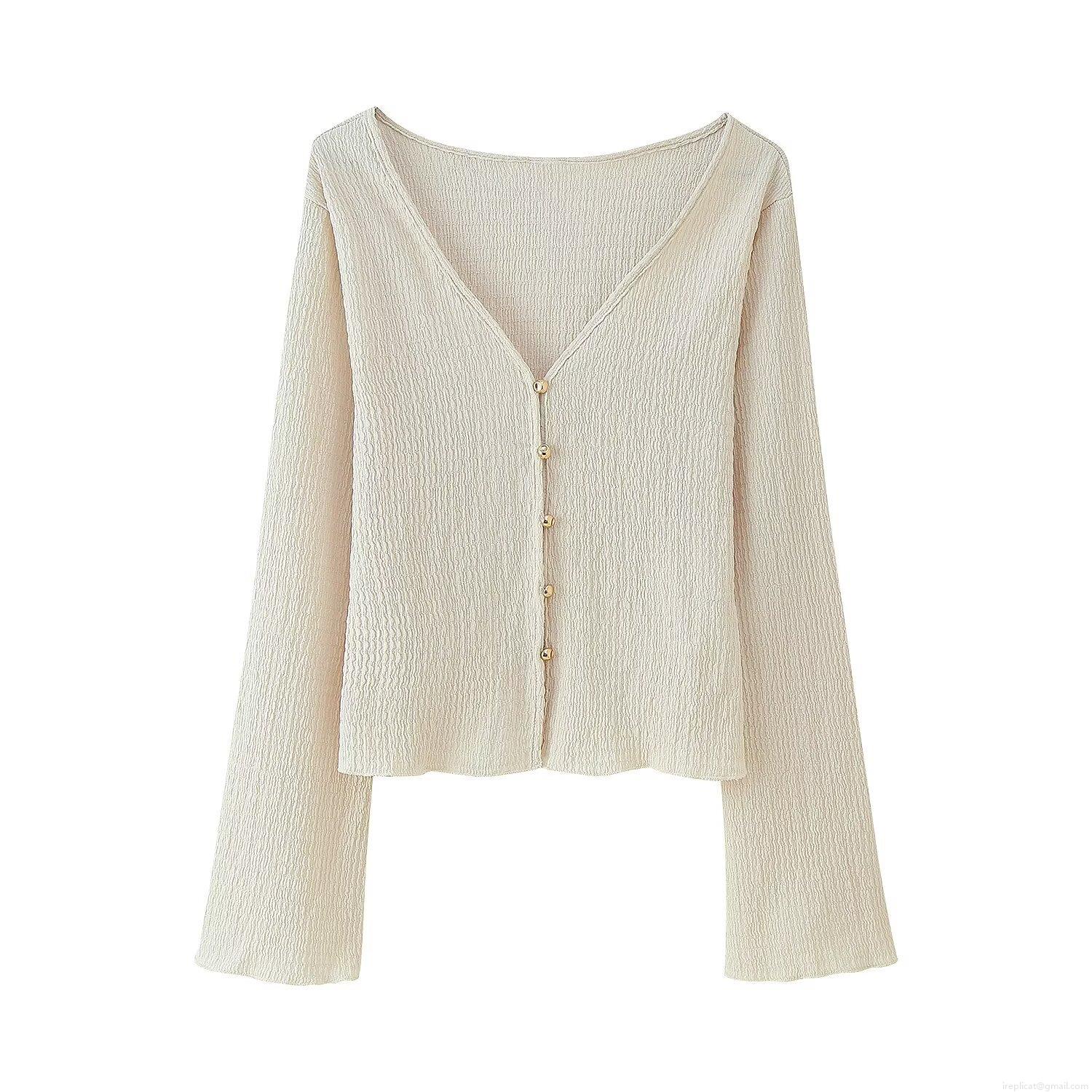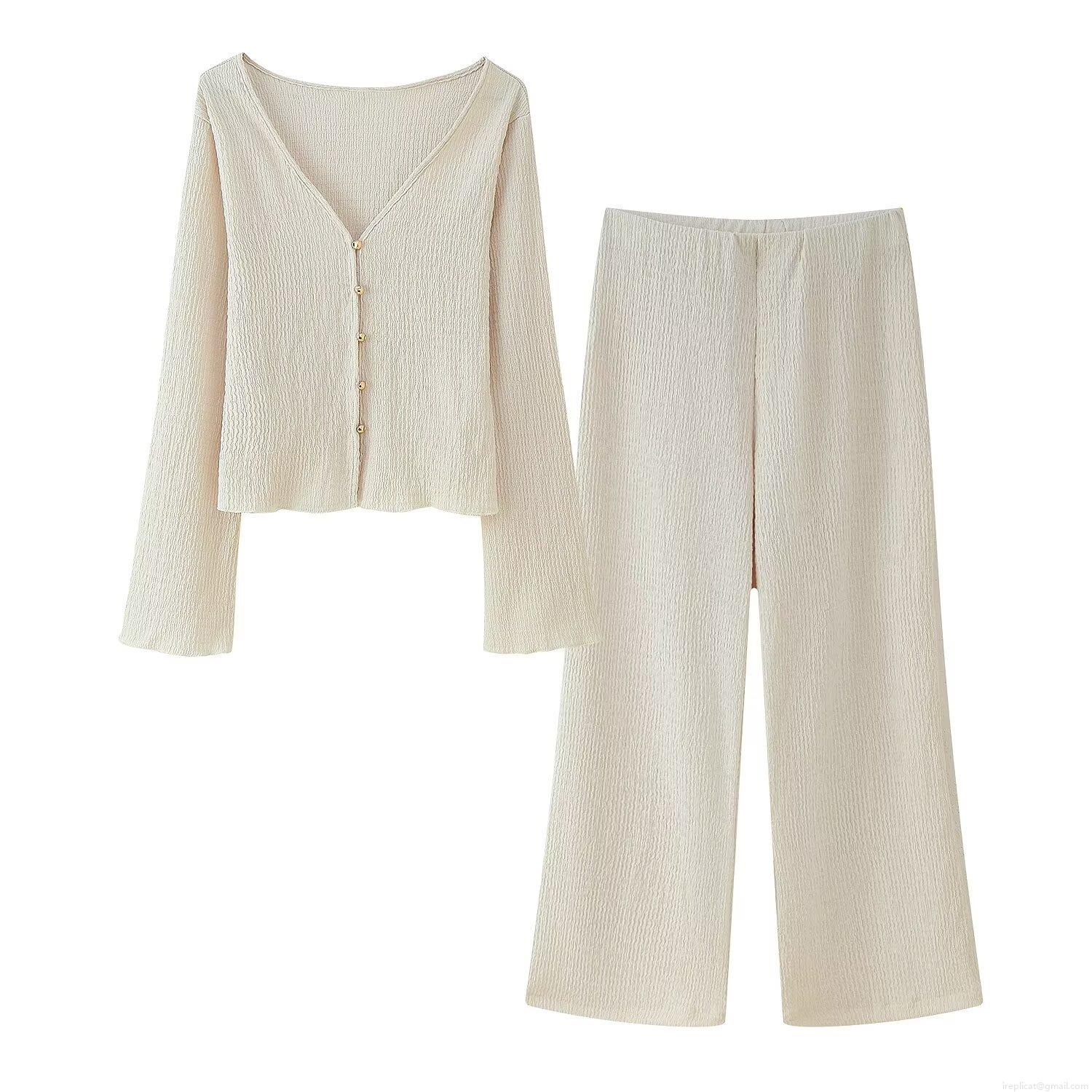 • Women's 2 Piece Outfits V-Neck Long Sleeve Single-Breasted Plisse Cardigan and Wide Leg Pants Set Solid Color Casual Streetwear Clothing Sets