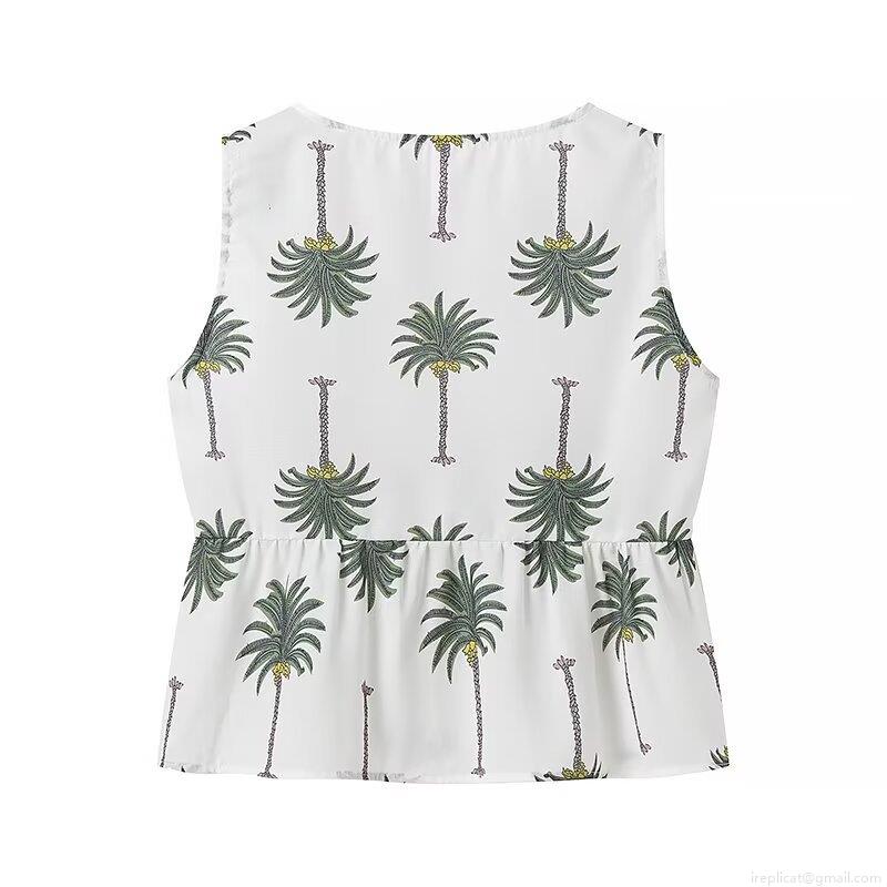 Coconut Tree, Palm Tree, Printing, V-neck, Lace, Wide-leg, All-over Print