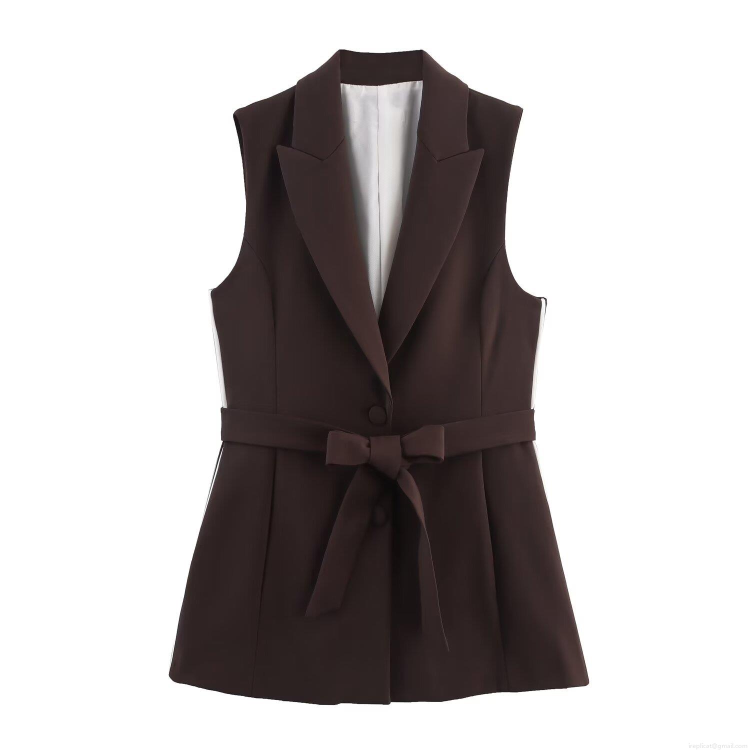 • Women's 2 Piece Polyester Outfit Sleeveless Lapel Vest With Butterfly Knot Belt And Straight Leg Pants White Side Stripe Detailing Dark Brown Elegant Commute Streetwear Casual Set