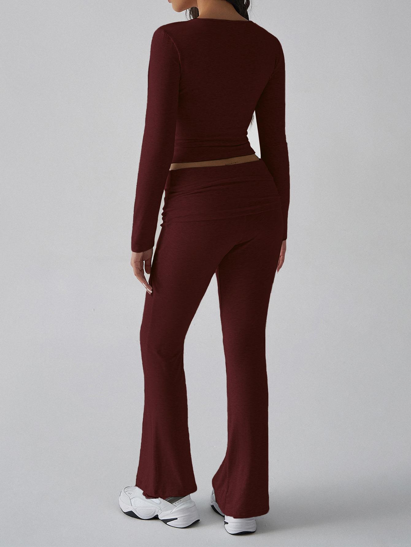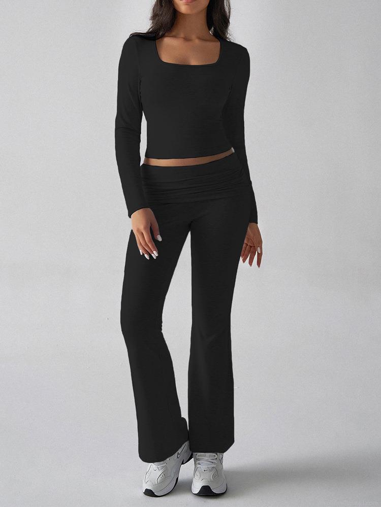 • Women's 2 Piece Ribbed Knit Outfits Sets Viscose Elastane Square Neck Long Sleeve Crop Top And High Waist Flare Pants Casual Athletic Tracksuit Lounge Set