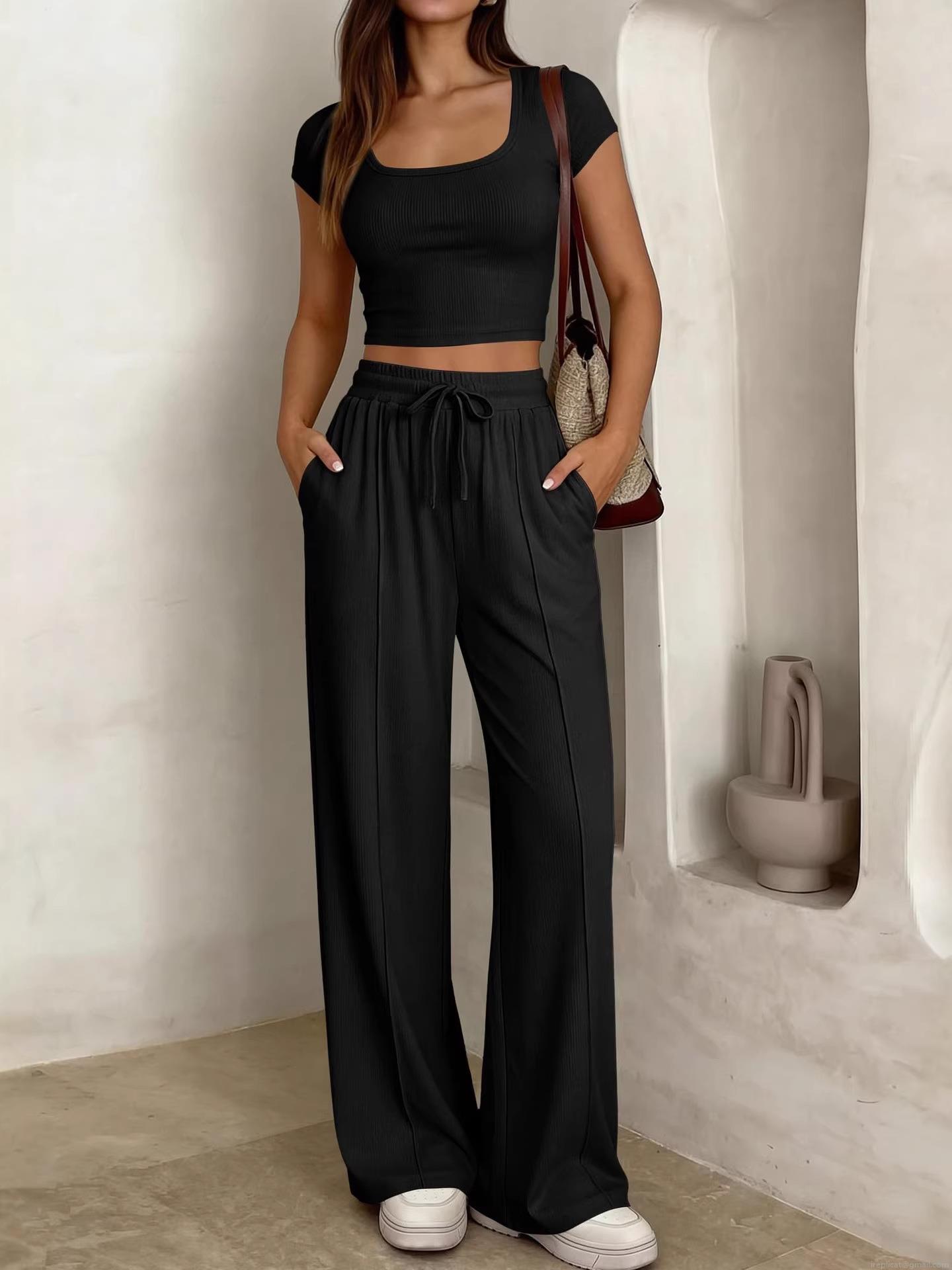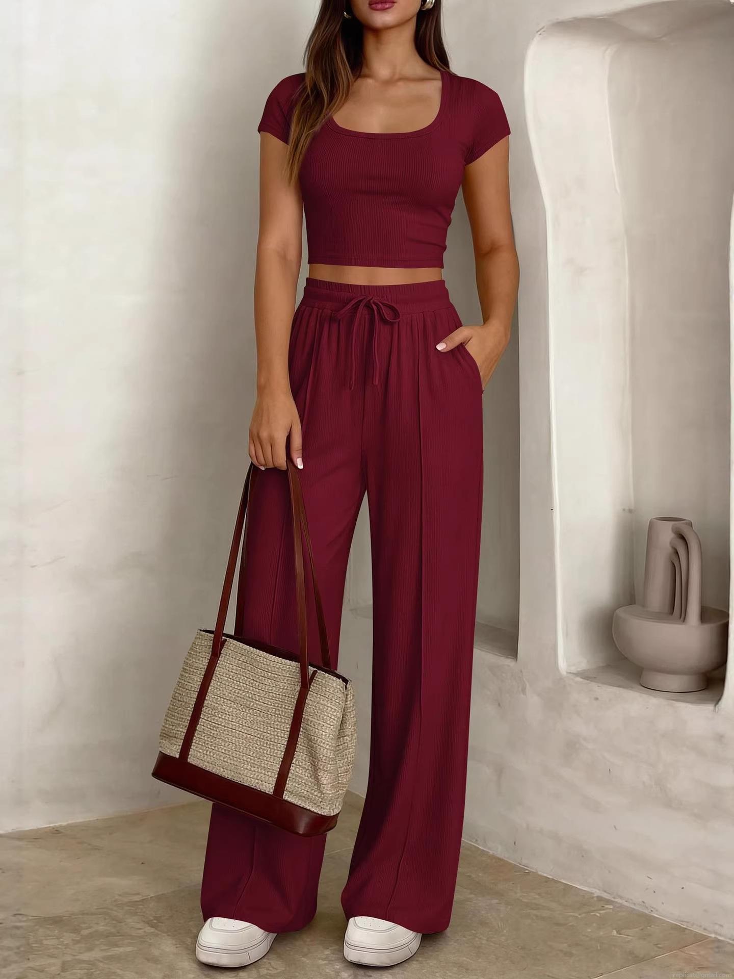 • Women's 2 Piece Ribbed Knit Sets Casual Short Sleeve Crop Top And High Waisted Drawstring Wide Leg Pants Tracksuit Y2K Outfits For Summer Commute