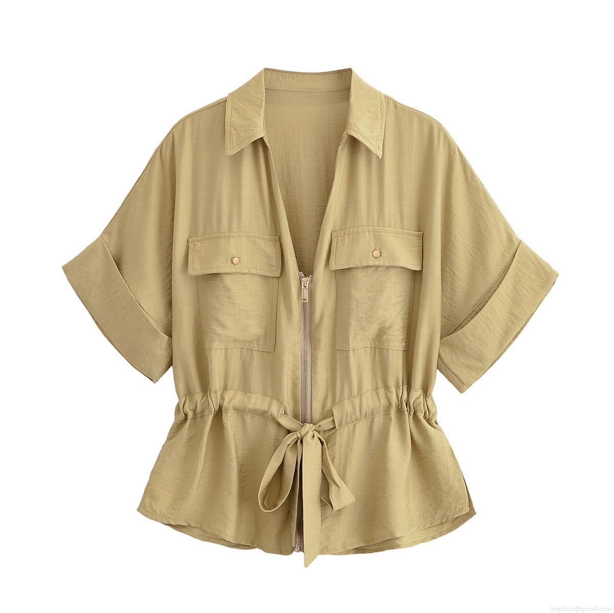• Women's 2 Piece Safari Outfit Set Polyester Short Sleeve Zipper Shirt And High Waist Wide Leg Pants Casual Streetwear Suits For Women Lady