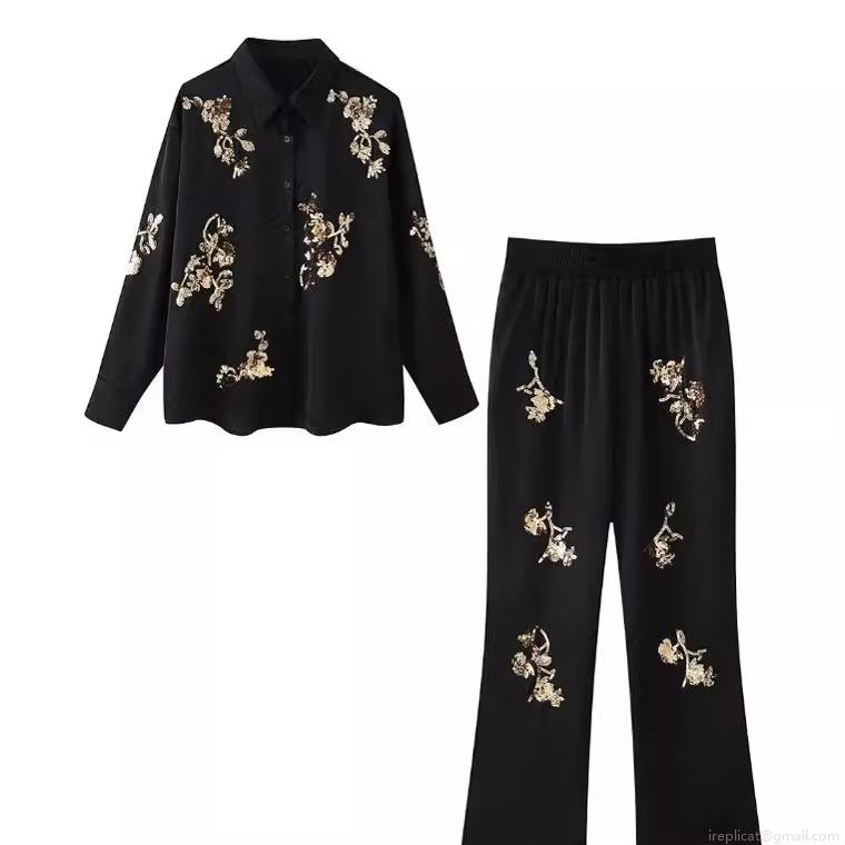 Plants And Flowers, Wide-leg Pants, Satin Texture, Lapel Button, Gold Sequin Embroidery