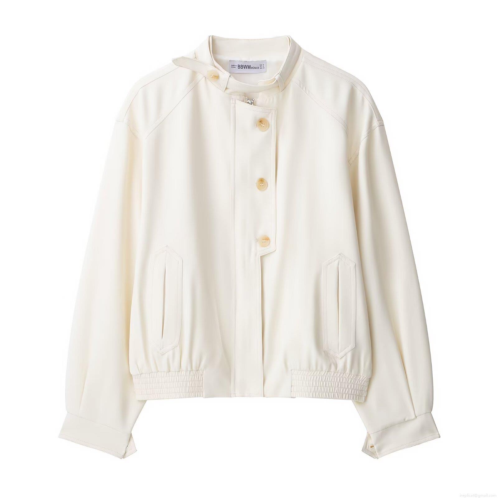 Solid Color, Wide-leg Pants, Pleated Design, Short Jacket, Stand-up Collar Buttons