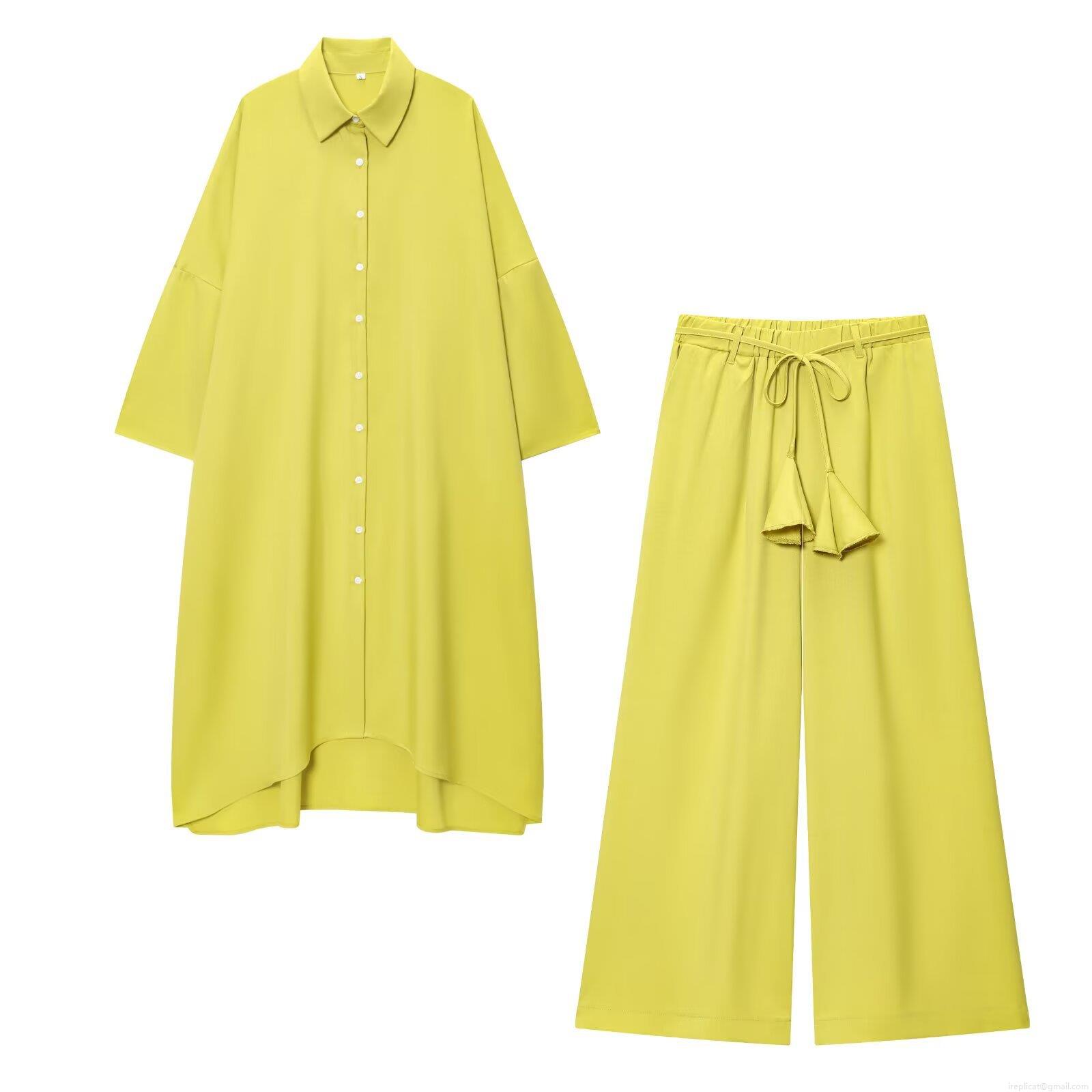 • Women's 2 Piece Set Casual Solid Color Long Shirt Dress and Drawstring Wide Leg Pants Suit Polyester Cotton Linen Texture Relaxed Fit Streetwear
