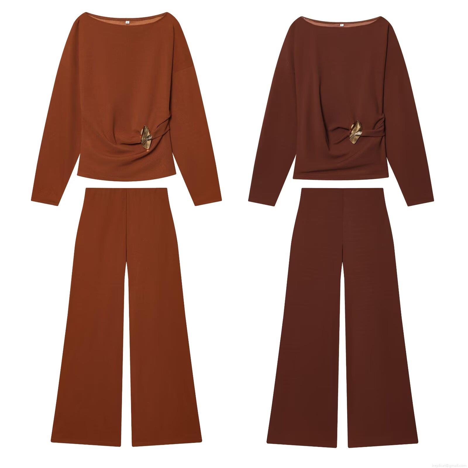• Women's 2 Piece Set Elegant Off Shoulder Long Sleeve Buckle Top And High Waist Wide Leg Pants Polyester Solid Color Streetwear Casual Outfit