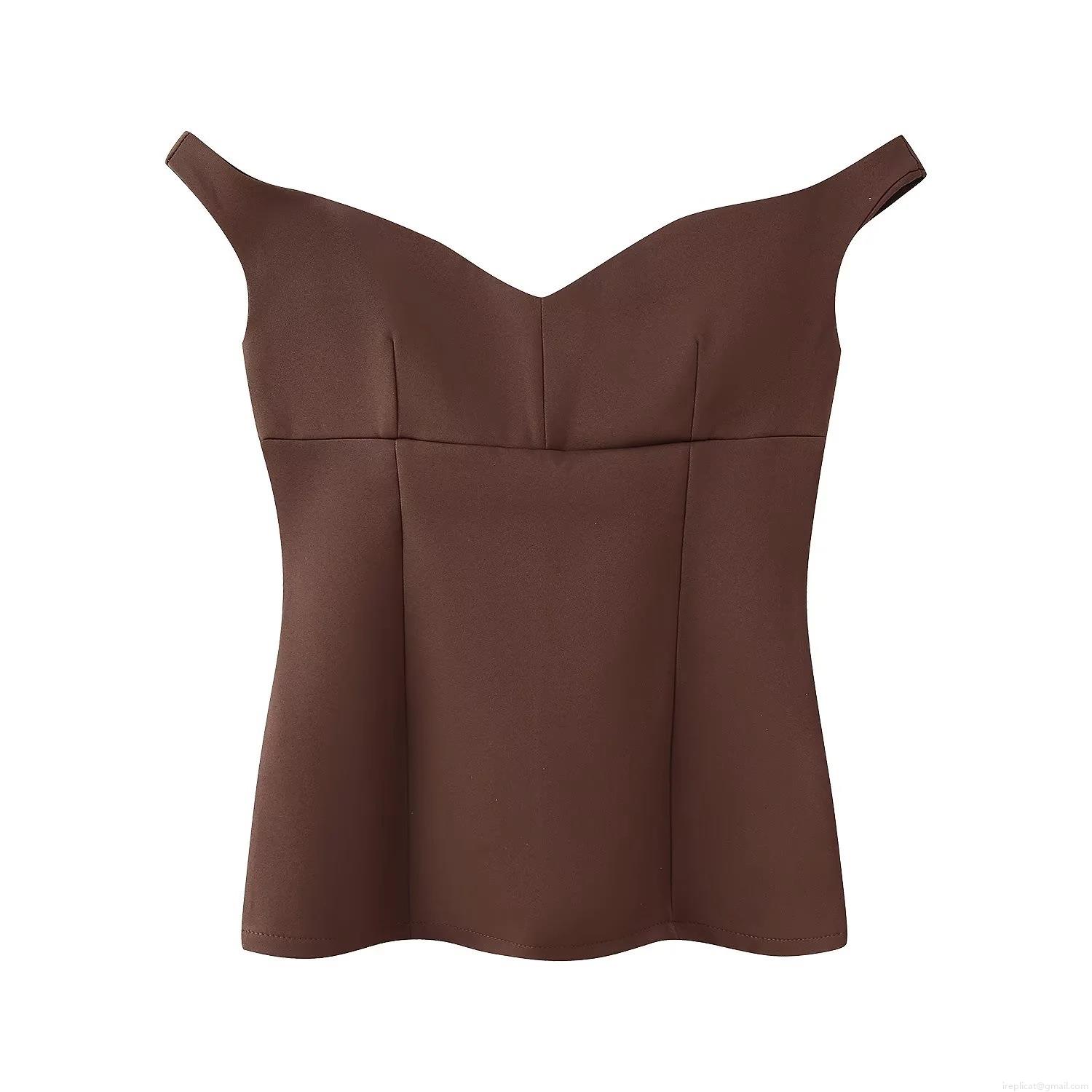 Women's 2 Piece Set Polyester Off-Shoulder V-Neck Corset Top And High Waist Wide Leg Pants Coffee Brown Elegant Streetwear Outfits For Women