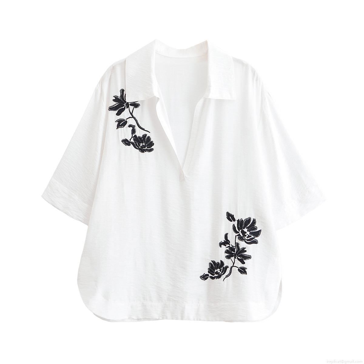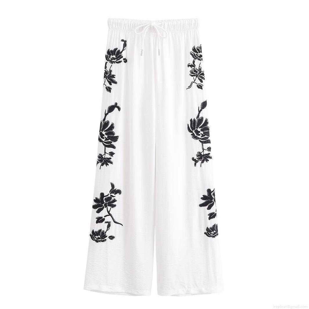 • Women's 2 Piece Set Sequin Flower Embroidery V Neck Short Sleeve Shirt and High Waist Drawstring Wide Leg Pants Summer Casual Vacation Street Style Outfits