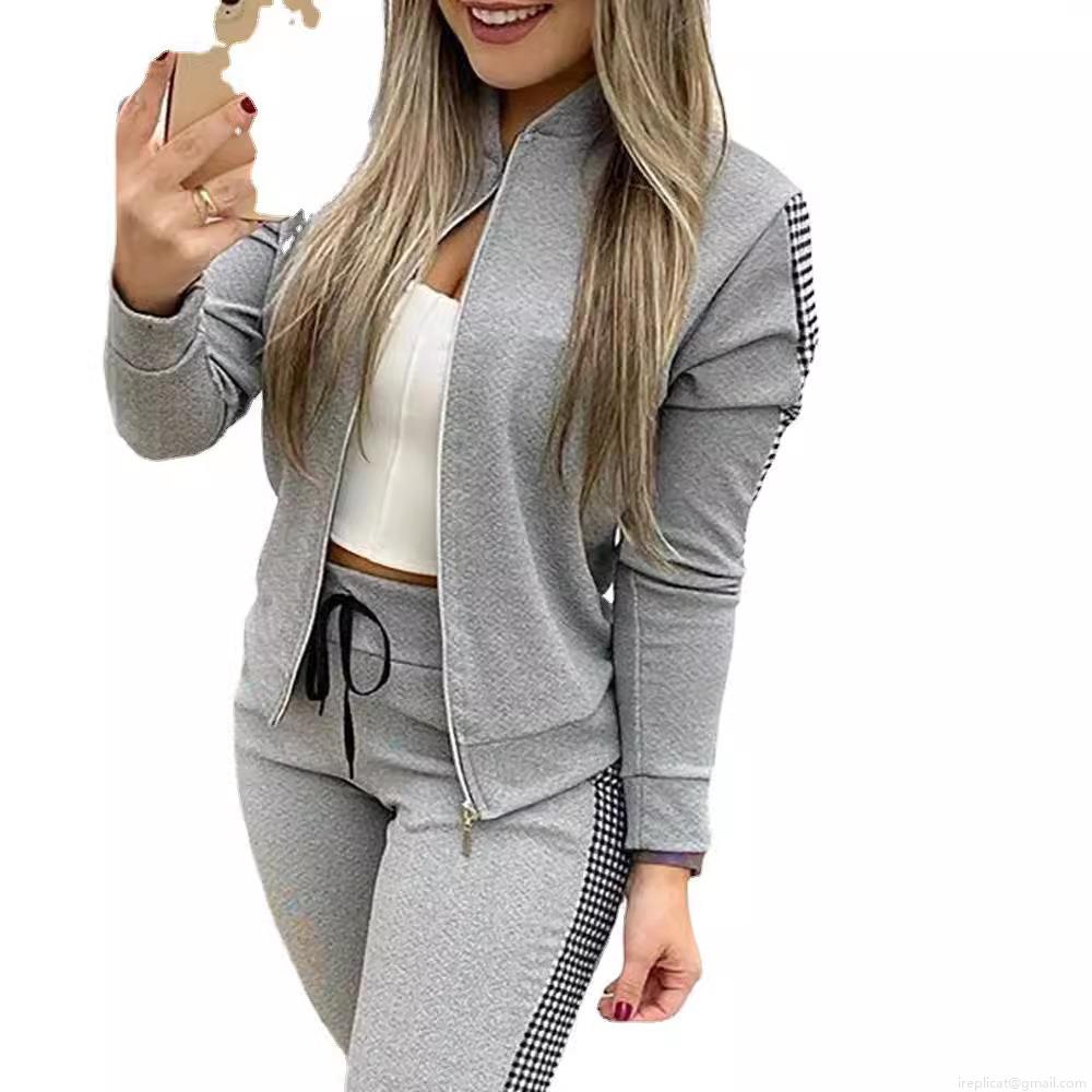 Women's 2 Piece Tracksuit Set 65% Cotton 35% Polyester Zip Up Stand Collar Patchwork Checkerboard Jacket And Sweatpants Casual Sport Outfits For Women