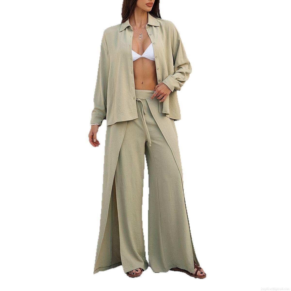 • Women's 2 Piece Vacation Set Long Sleeve Button Down Shirt And High Waisted Side Slit Wide Leg Pants Casual Textured Solid Color Outfits