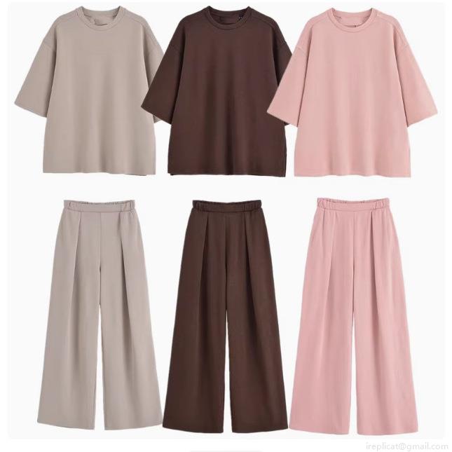 • Women's 2025 Summer Casual Loose T-Shirt and Wide Leg Pants Set Solid Color Round Neck Short Sleeve Top High Waist Trousers Lounge Wear Outfits