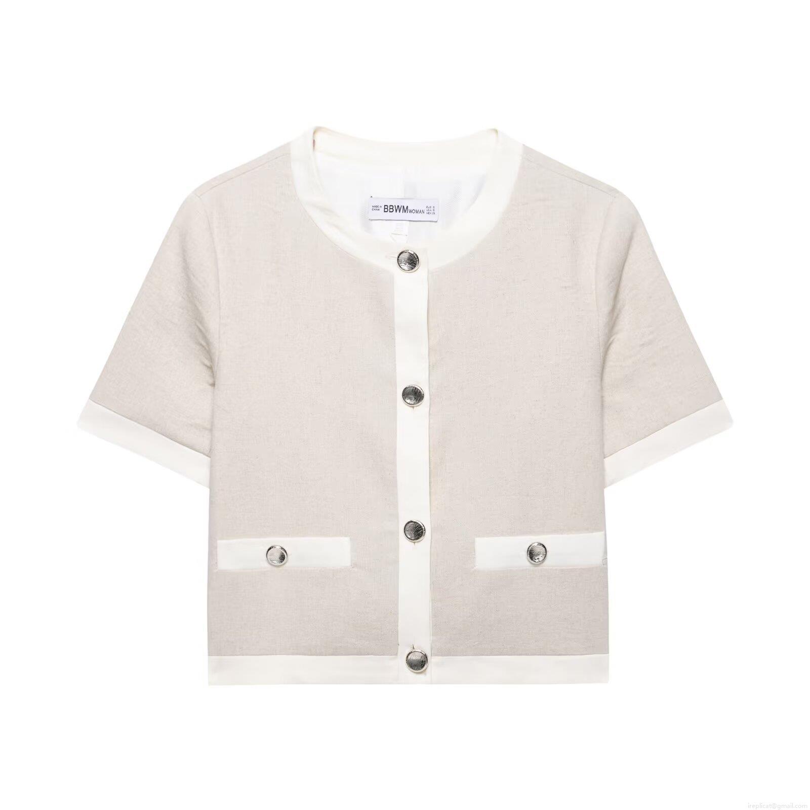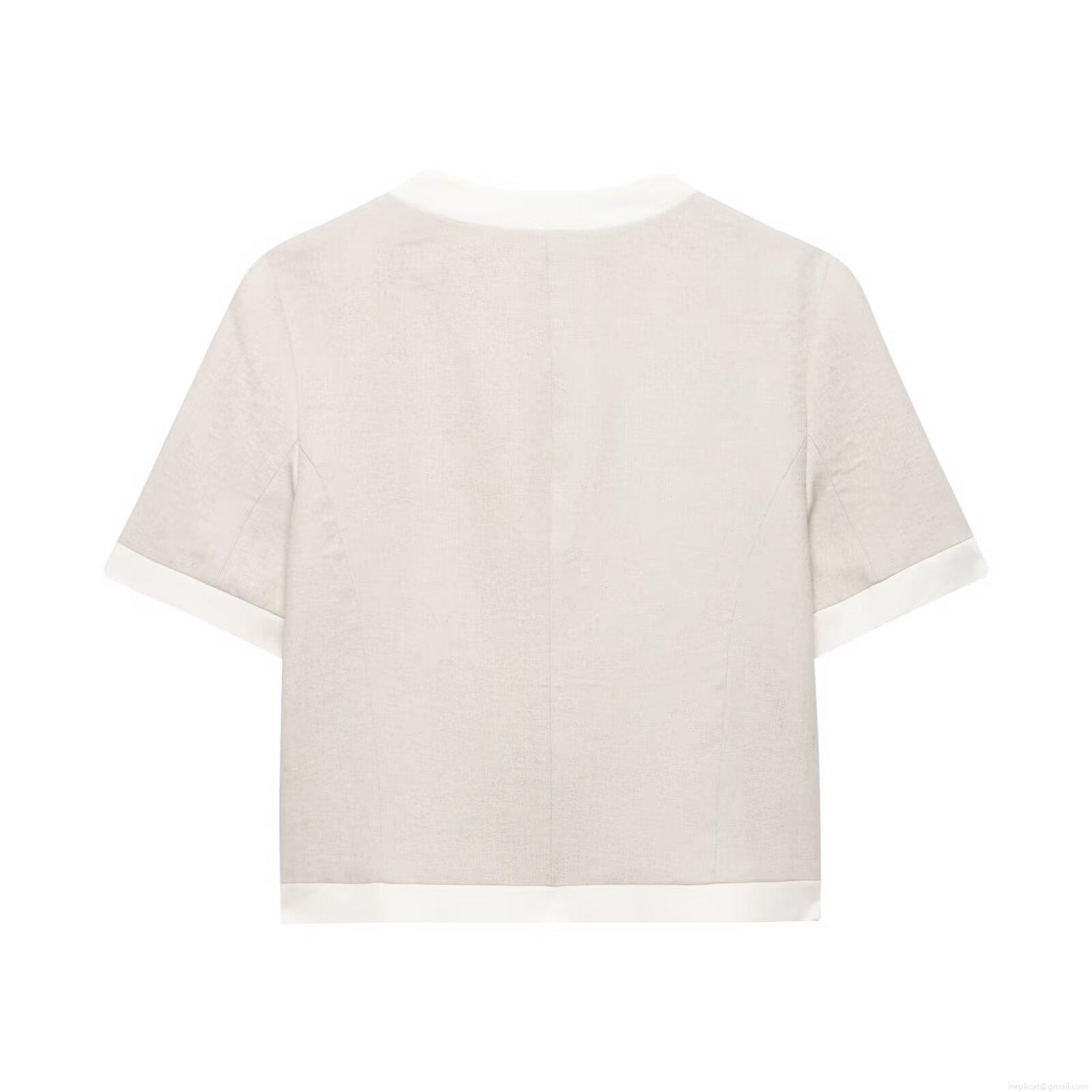 Women's 2-Piece Casual Set Short Sleeve Crop Blazer Top And High Waist Wide Leg Trousers Minimalist Oat Beige Linen Texture Outfits With Contrast Trim