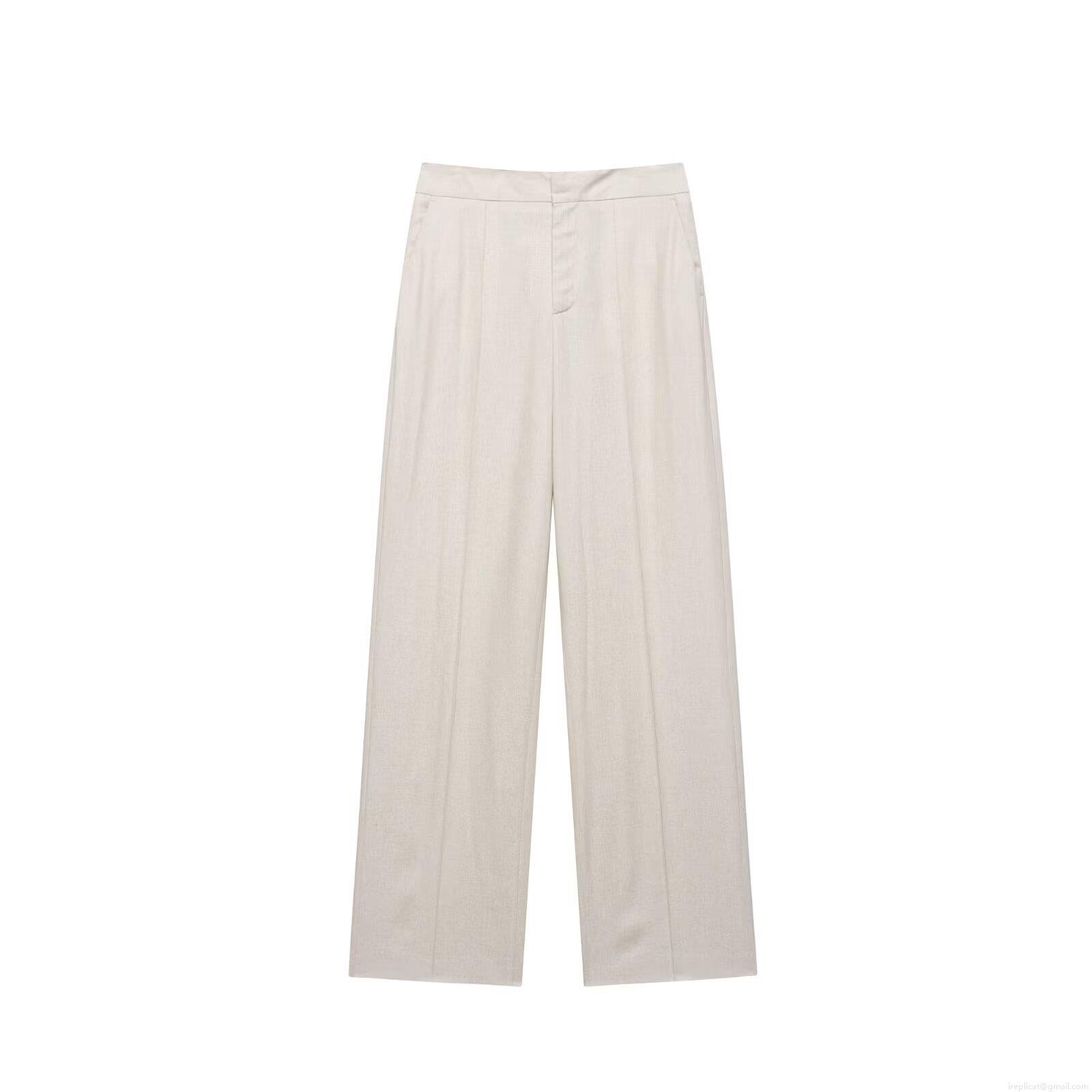 • Women's 2-Piece Casual Set Short Sleeve Crop Blazer Top And High Waist Wide Leg Trousers Minimalist Oat Beige Linen Texture Outfits With Contrast Trim