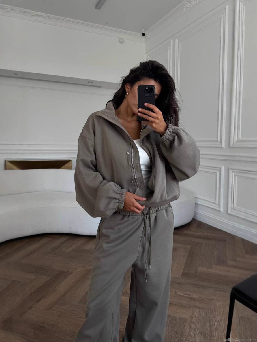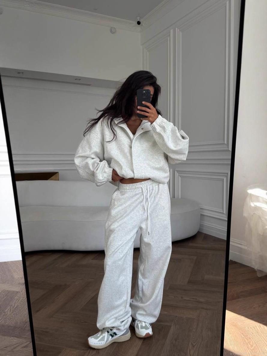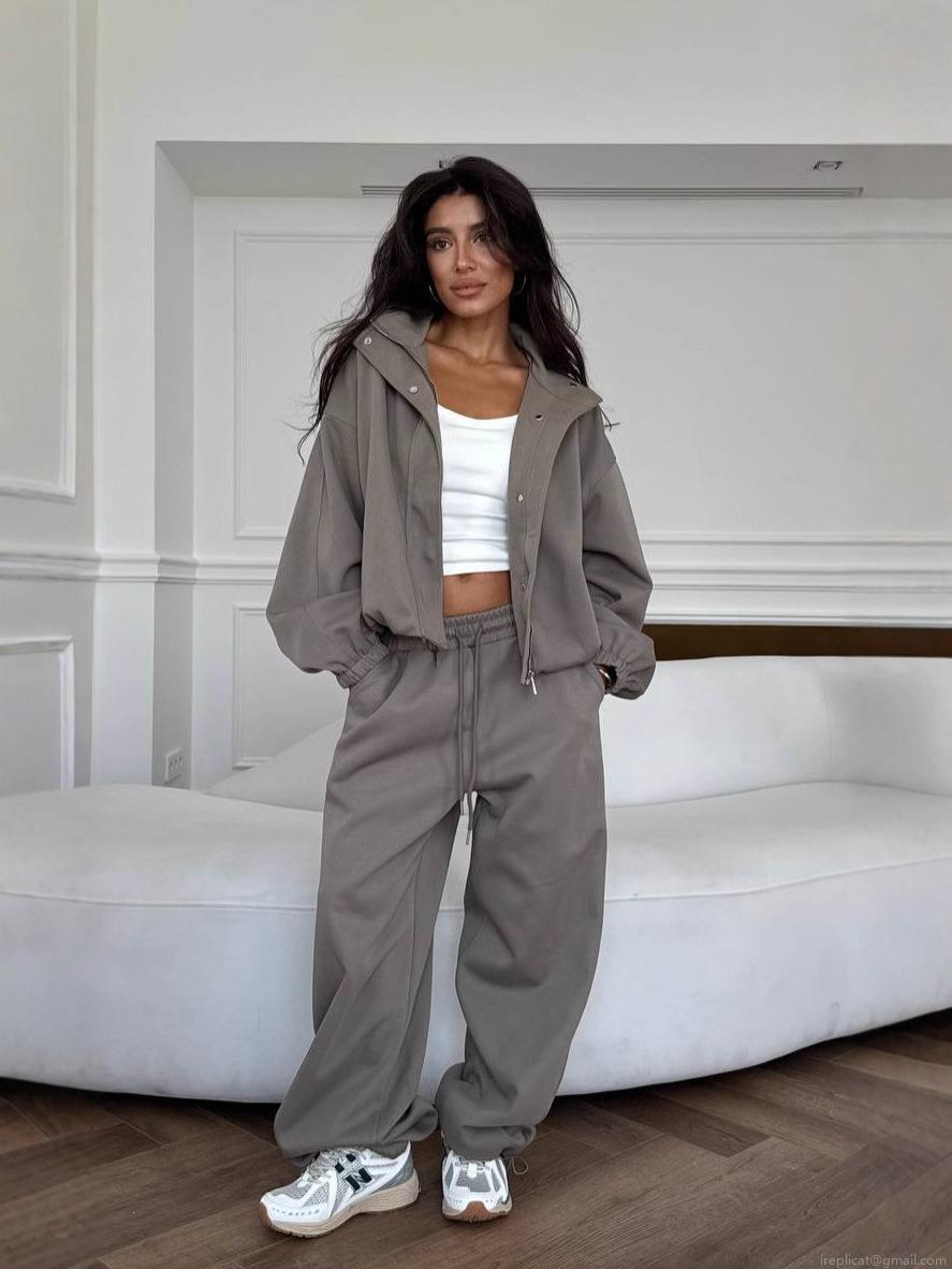 • Women's 2-Piece Casual Sportswear Set Cotton Blend Knitted Zip Up Jacket And High Waist Wide Leg Drawstring Pants Solid Streetwear Tracksuit
