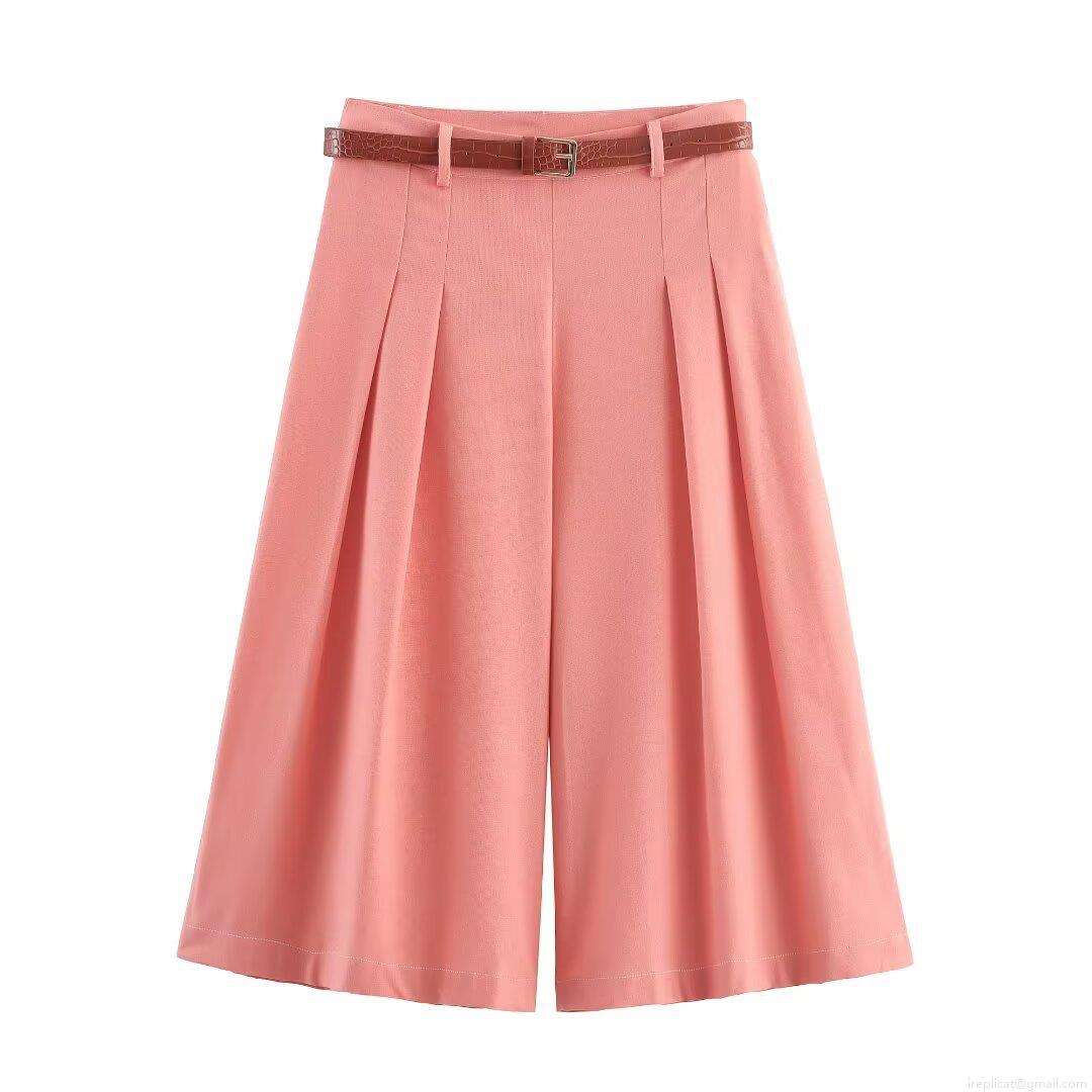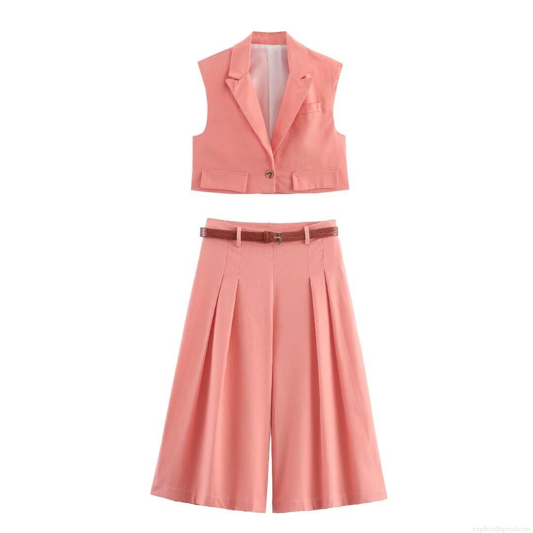 • Women-s 2-Piece Fashion Set Short Sleeveless Lapel Vest And High Waist Pleated Wide Leg Pants With Belt Coral Pink Polyester Streetwear Casual Outfit For Women