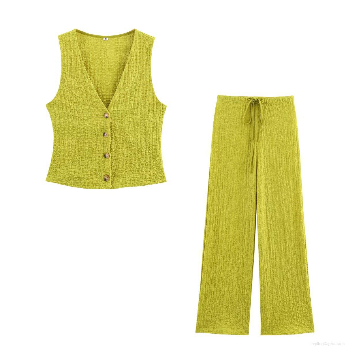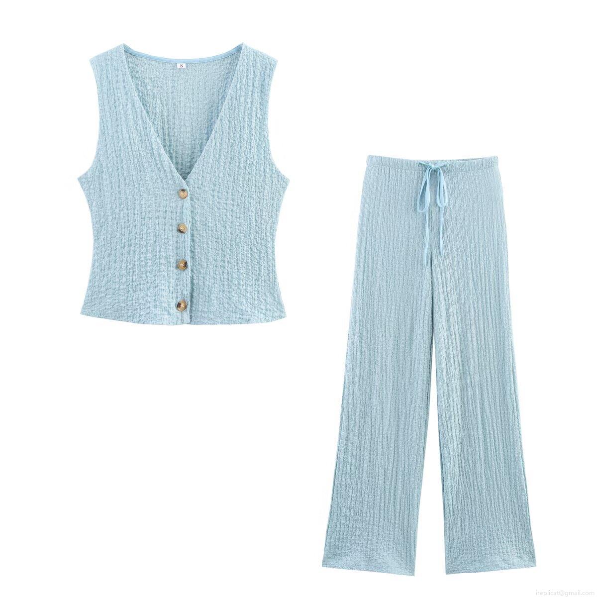 • Women's 2-Piece Outfit Set V-Neck Button Down Vest And Drawstring Wide Leg Pants Summer Casual Seersucker Textured Sleeveless Suit For Women