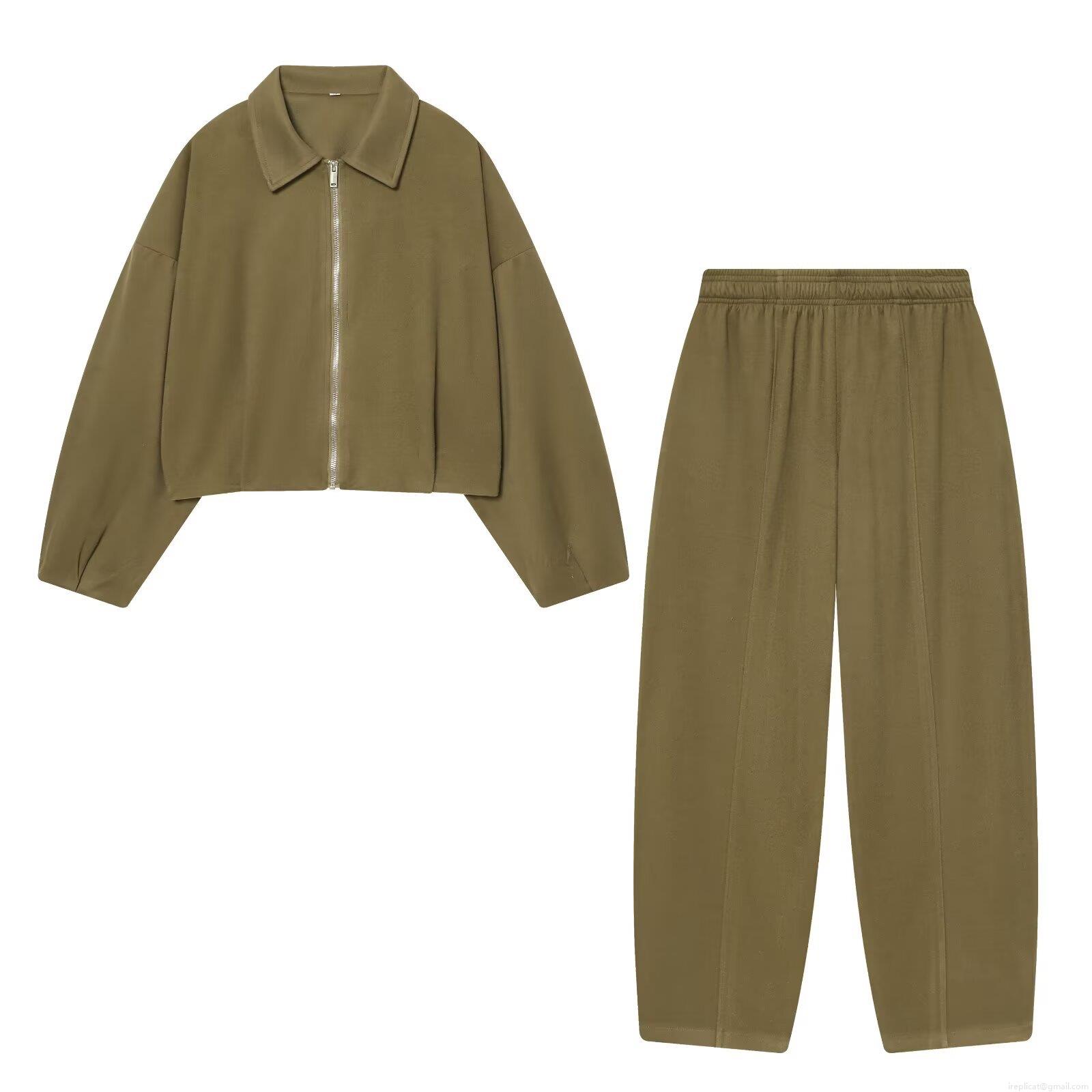 • Women's 2-Piece Outfits Casual Zipper Lapel Jacket And Wide Leg Pants Set Solid Color Long Sleeve Loose Tracksuit For Autumn Winter