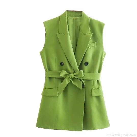 Women's 2-Piece Suit Set Chic 100% Polyester Sleeveless Double Breasted Blazer Vest With Belt And High Waist Wide Leg Pants Office Casual Streetwear Grass Green Outfit