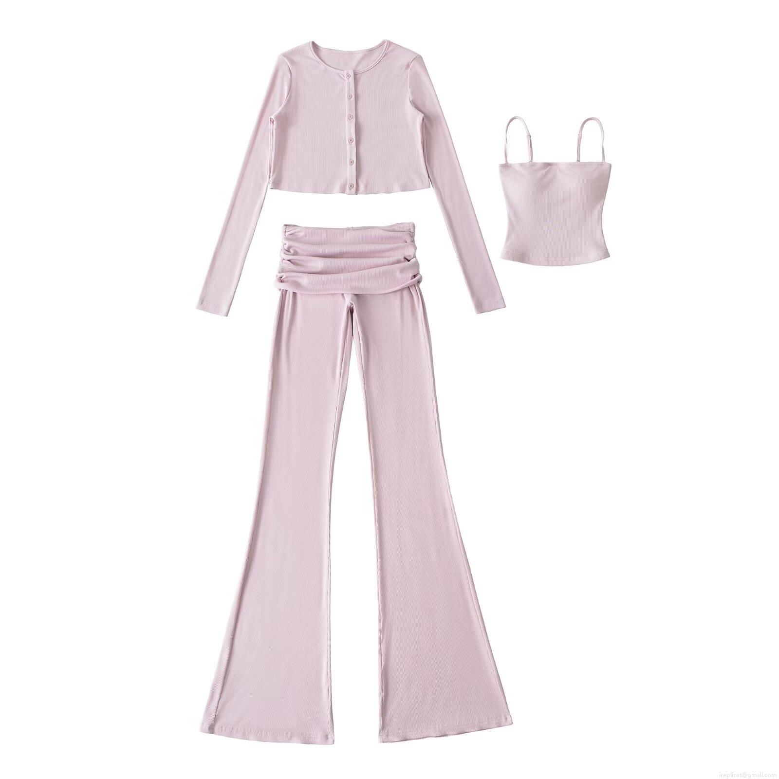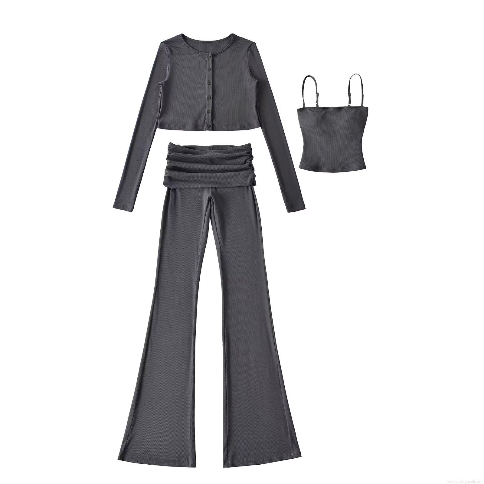 • Women's 3 Piece Ribbed Knit Outfits Sexy Cami Top Button Down Cardigan High Waisted Flare Pants Sexy Lounge Sets Streetwear Tracksuits For Fall Autumn