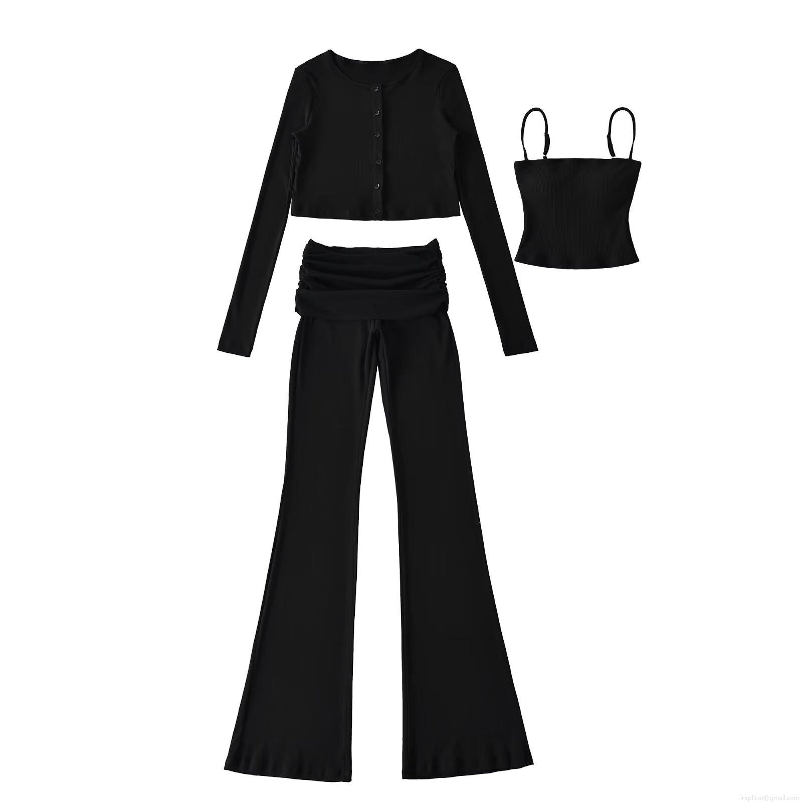 Women's 3 Piece Ribbed Knit Outfits Sexy Cami Top Button Down Cardigan High Waisted Flare Pants Sexy Lounge Sets Streetwear Tracksuits For Fall Autumn