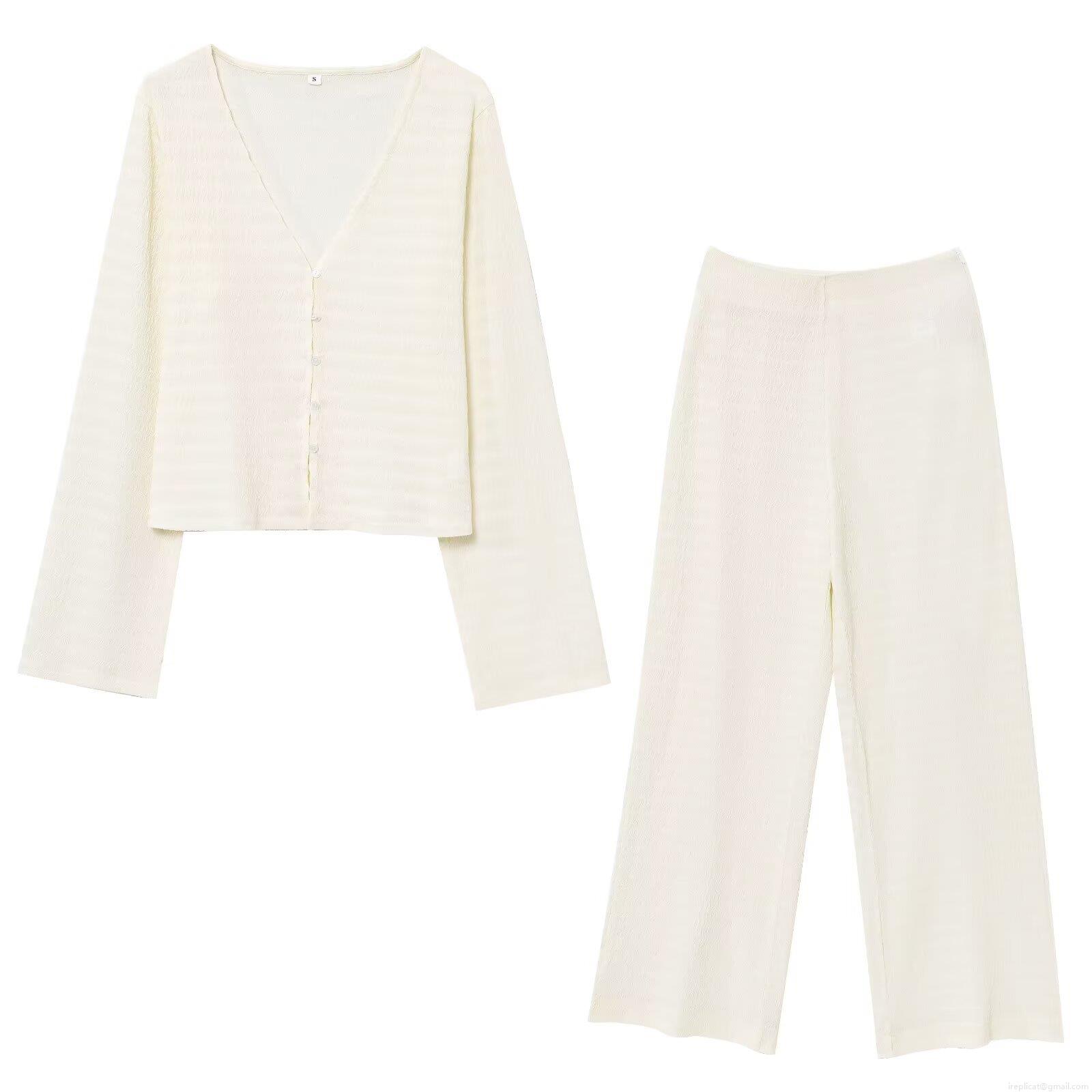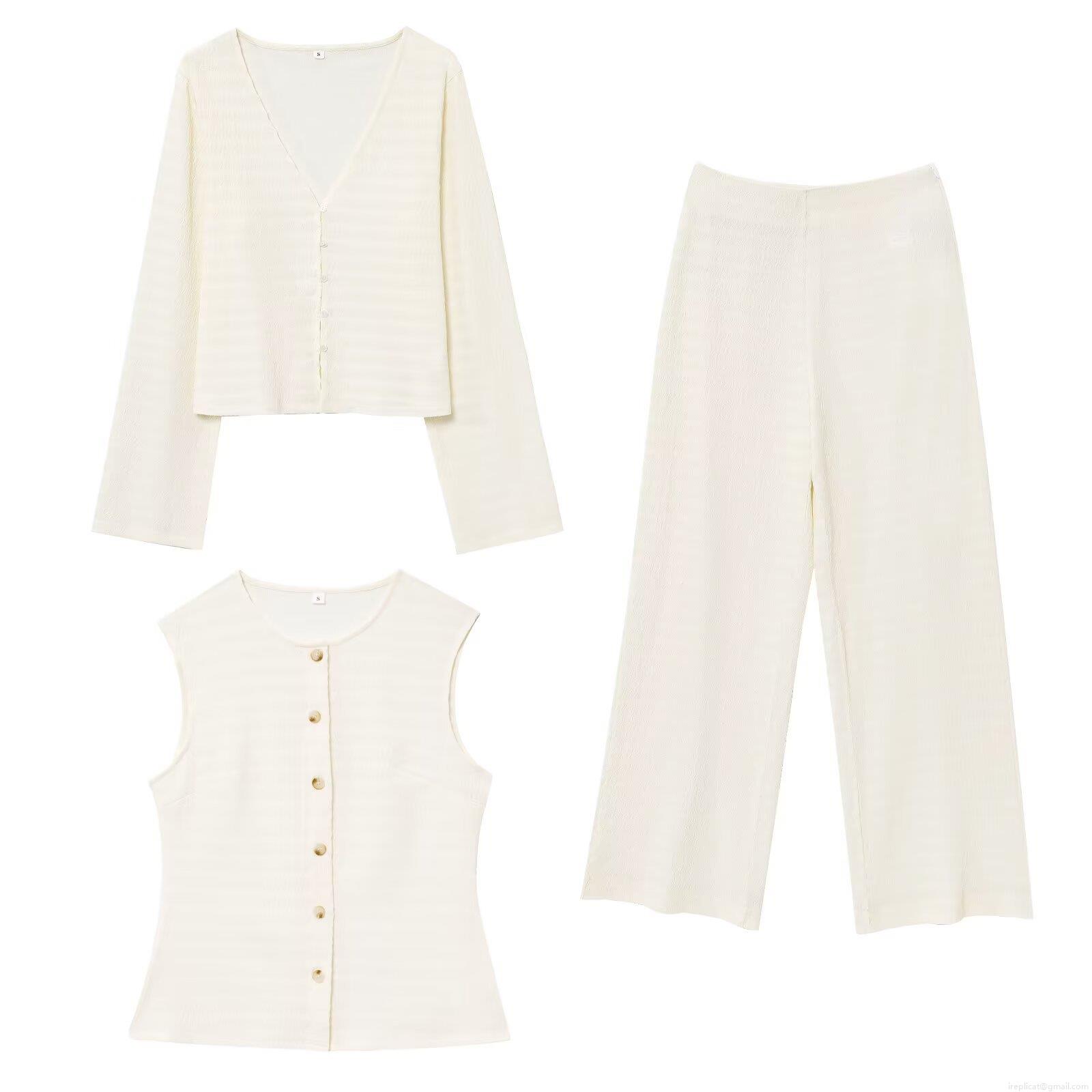 • Women's 3 Piece Textured Knit Set Open Front Cardigan Sleeveless Vest And Wide Leg Pants Solid Cream Casual Loungewear Outfit