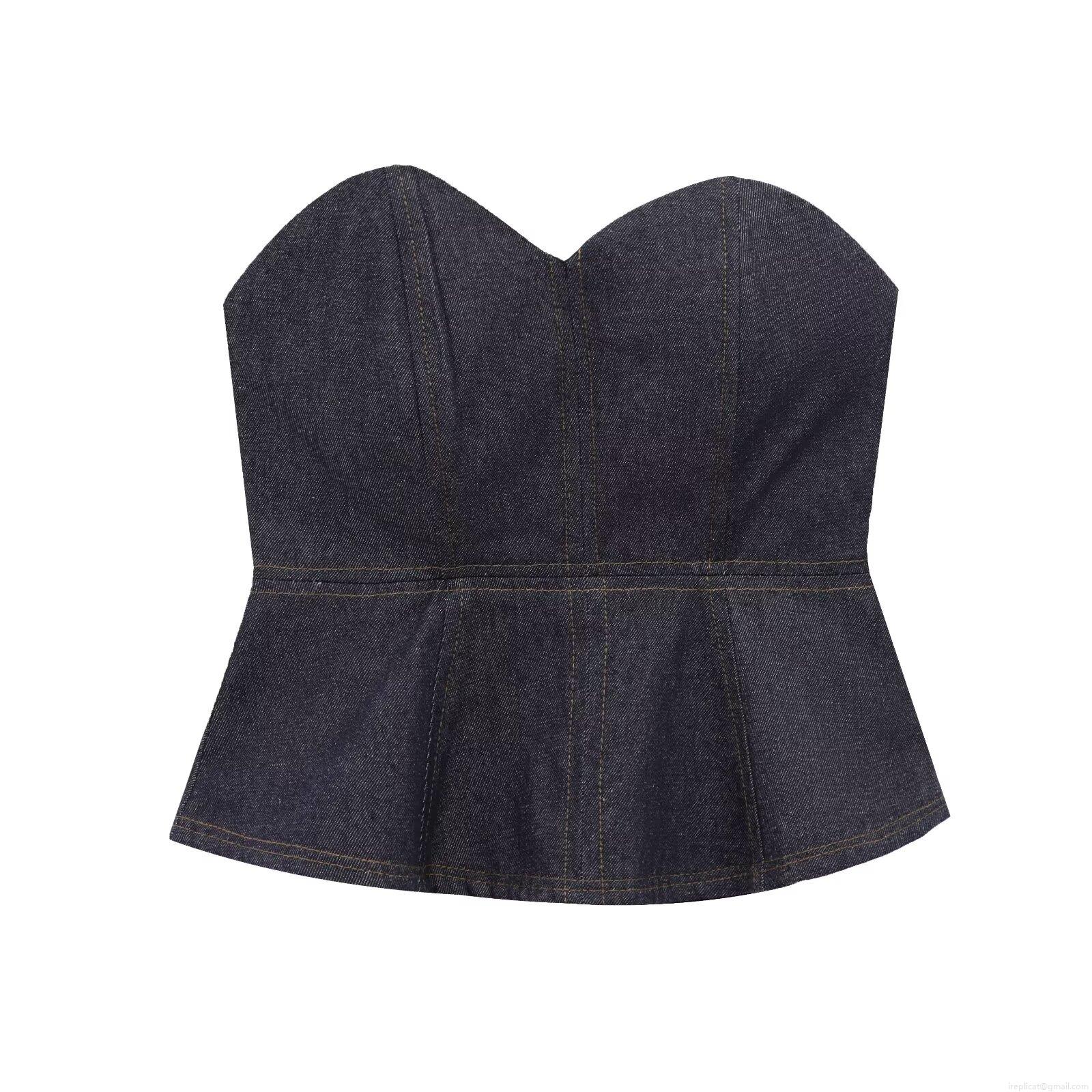 • Women's 3-Piece Dark Blue Denim Set Includes Blazer Jacket Bustier Corset Top And High Waist Wide Leg Pants Streetwear Chic Casual Outfit For Women