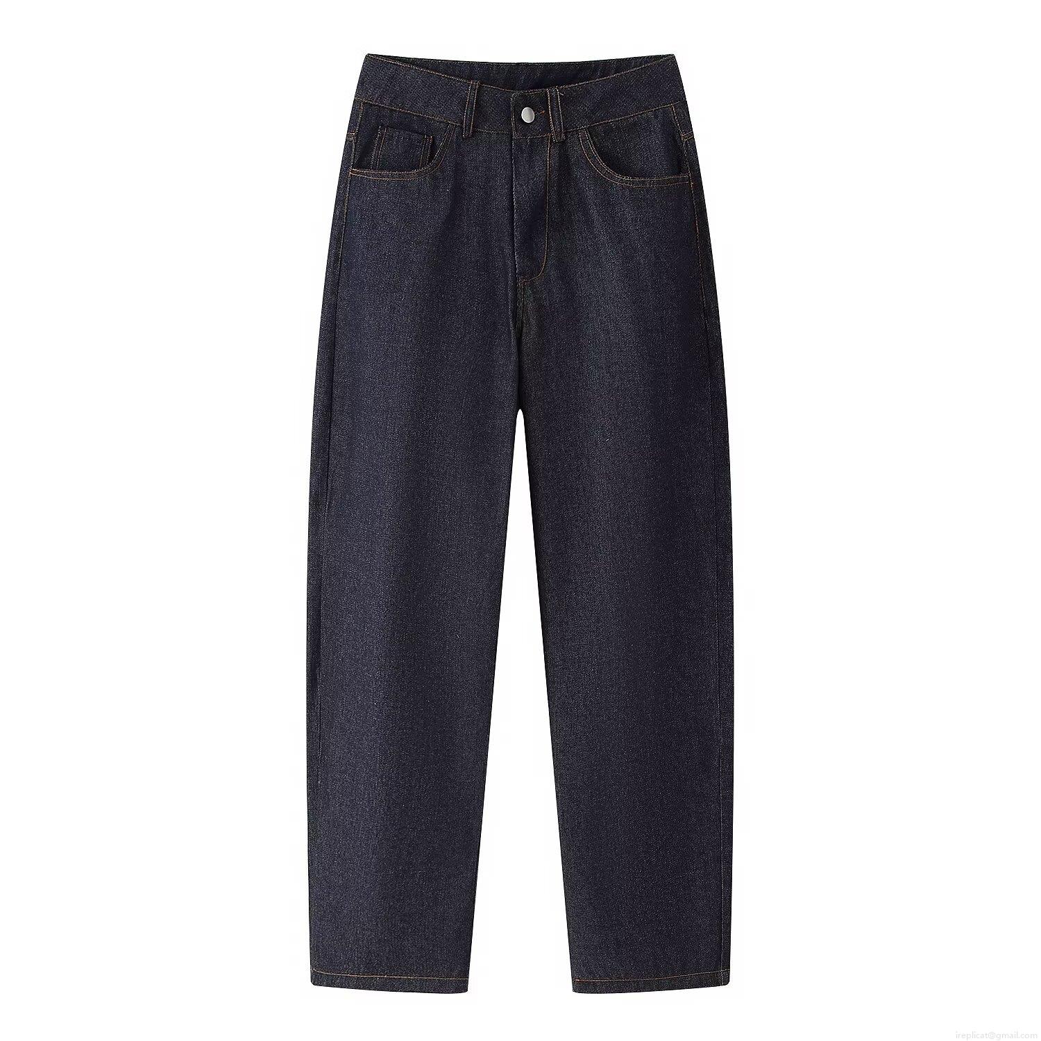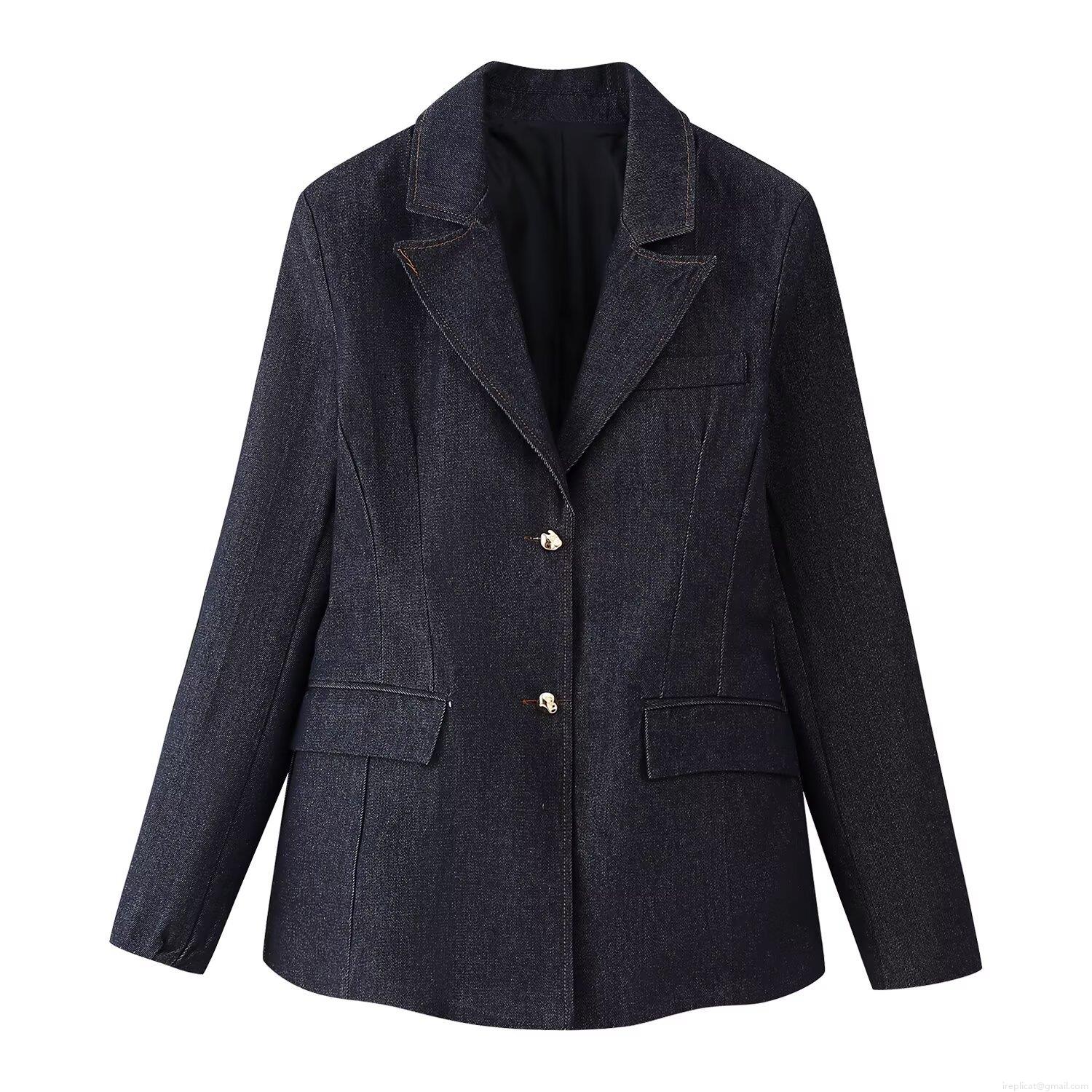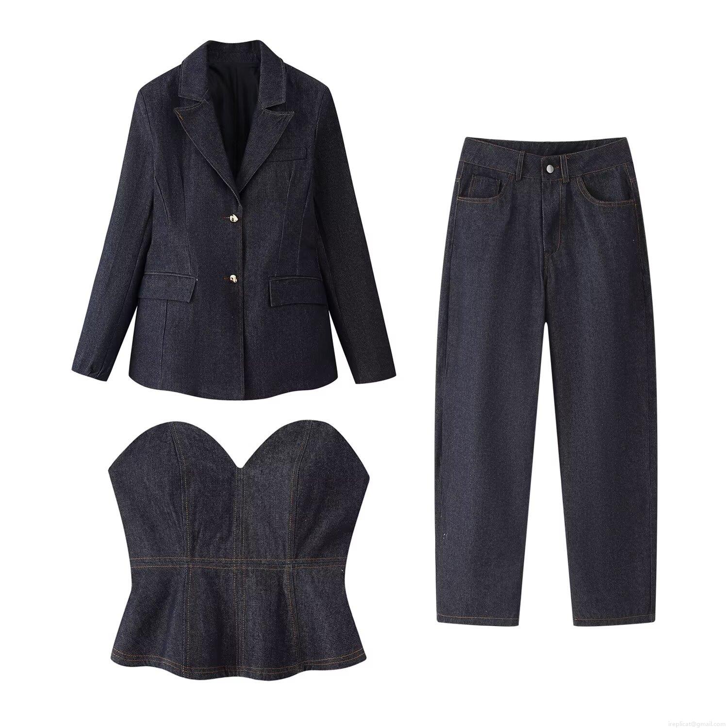 Women's 3-Piece Denim Suit Set Including Lapel Blazer Jacket Tight Heart Shaped Tube Top and Straight Leg Pants Deep Blue Streetwear Fashion Outfit