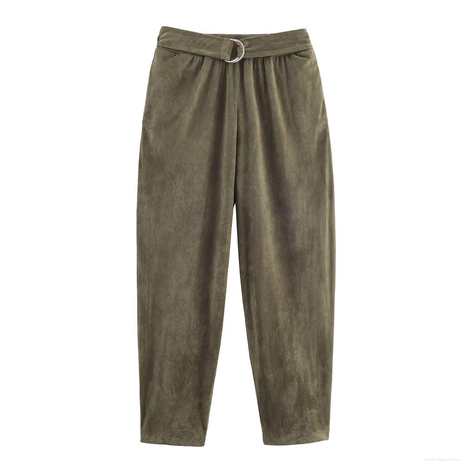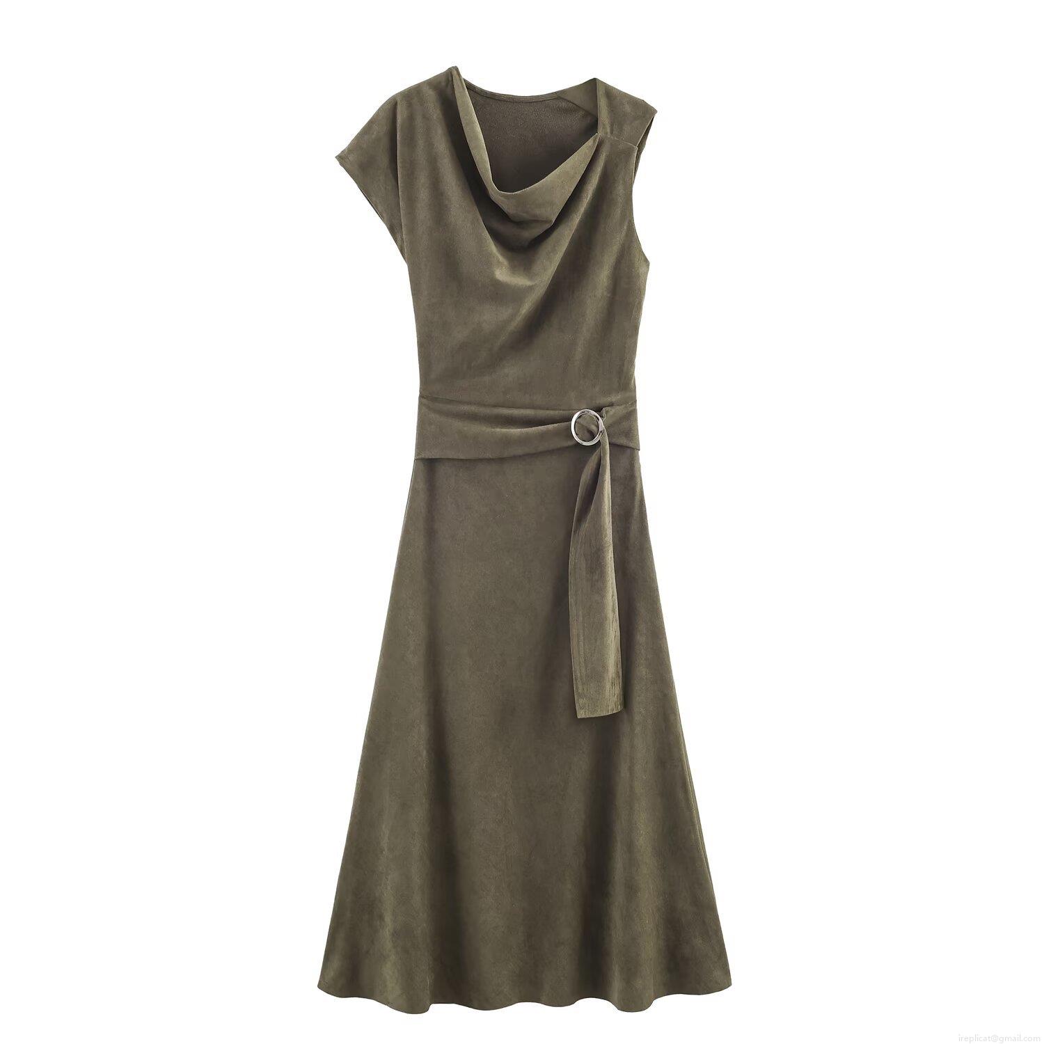 • Women's 3-Piece Faux Suede Casual Set Long Sleeve Round Neck Top Asymmetrical Sleeveless Dress Belted Balloon Pants Streetwear Autumn Olive Green
