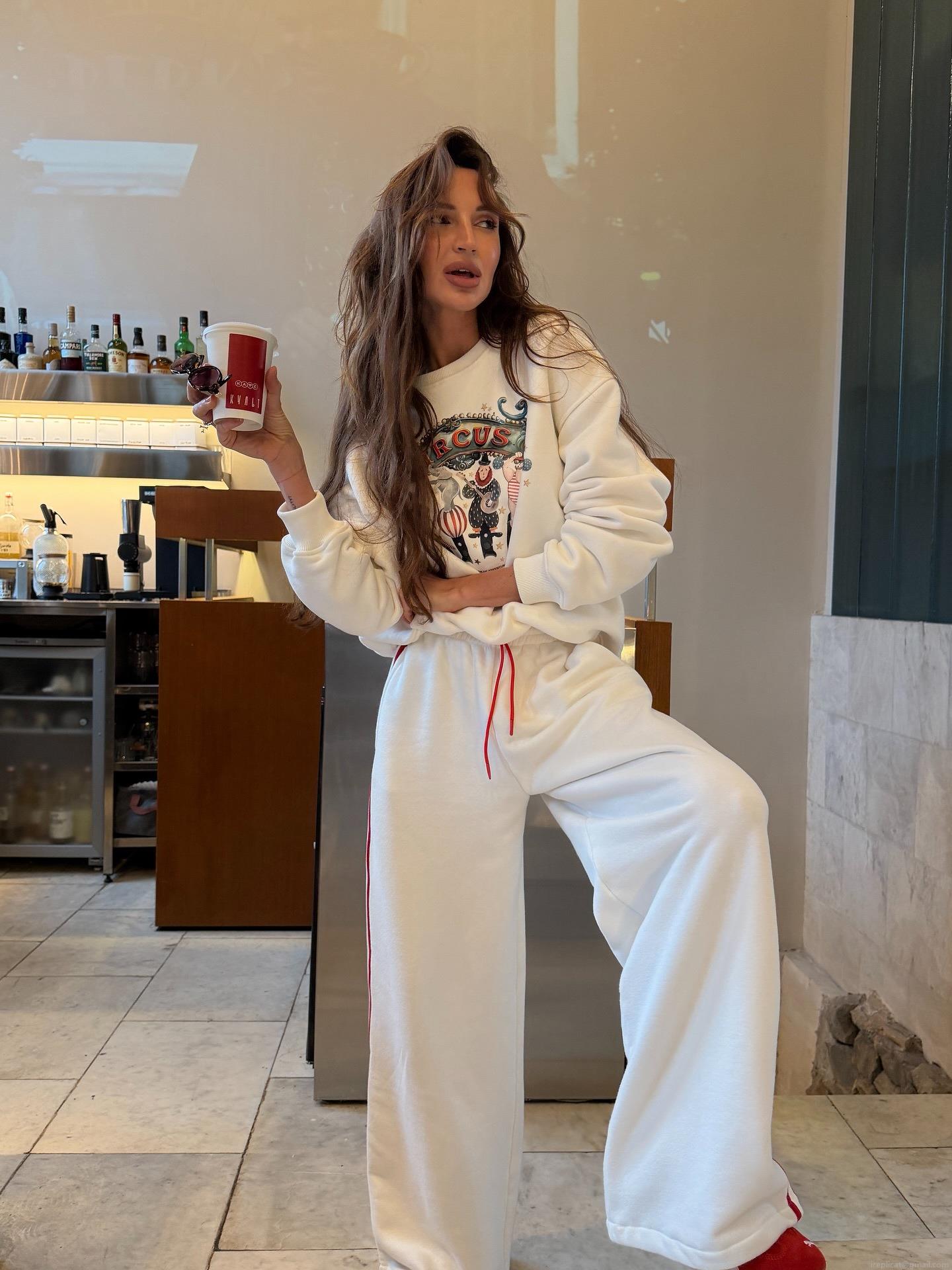 • Women's American Retro Circus Print Sweatshirt and Pants Set Cotton Blend Long Sleeve Crewneck Loose Two Piece Outfits with Red Side Stripes Casual Sporty Streetwear Tracksuit