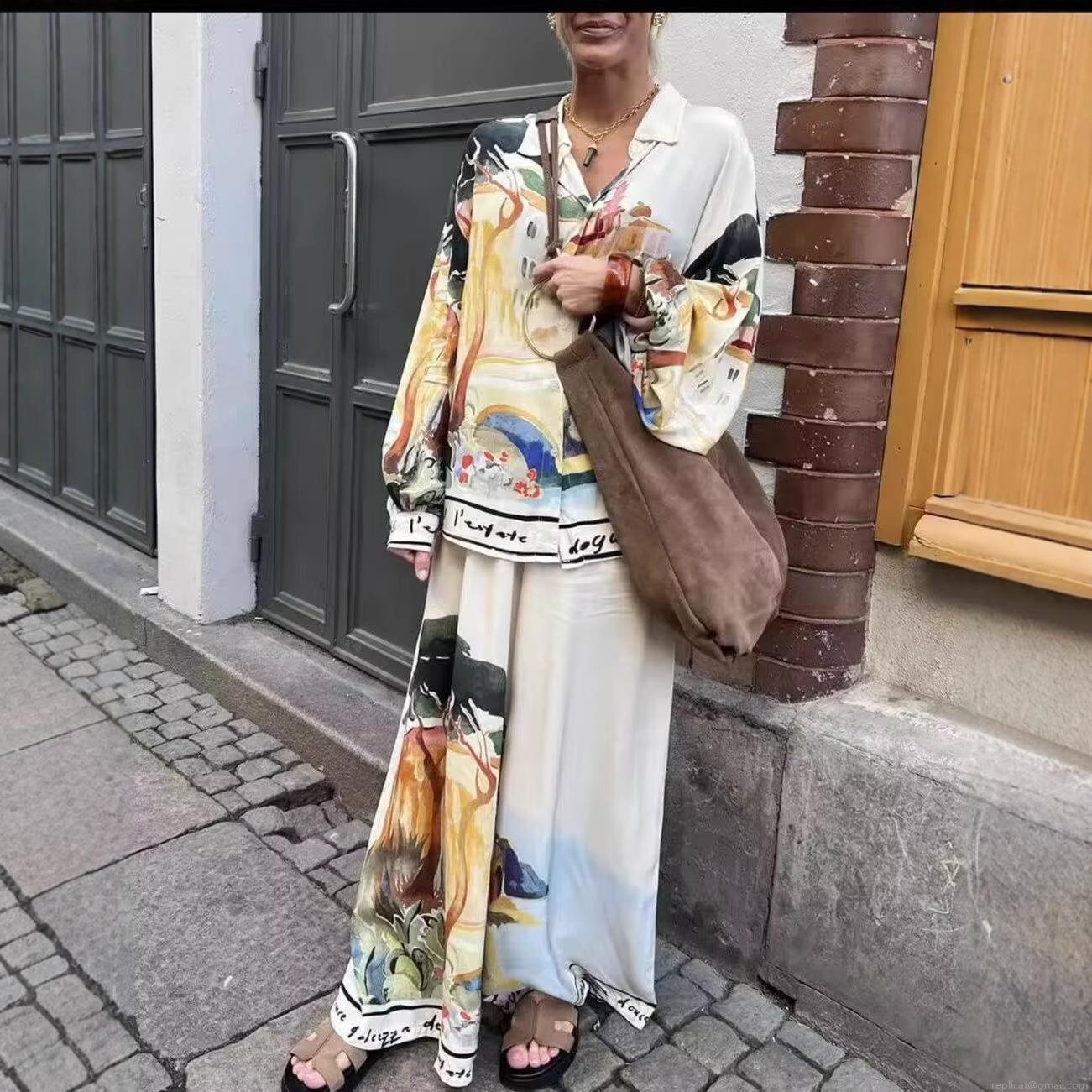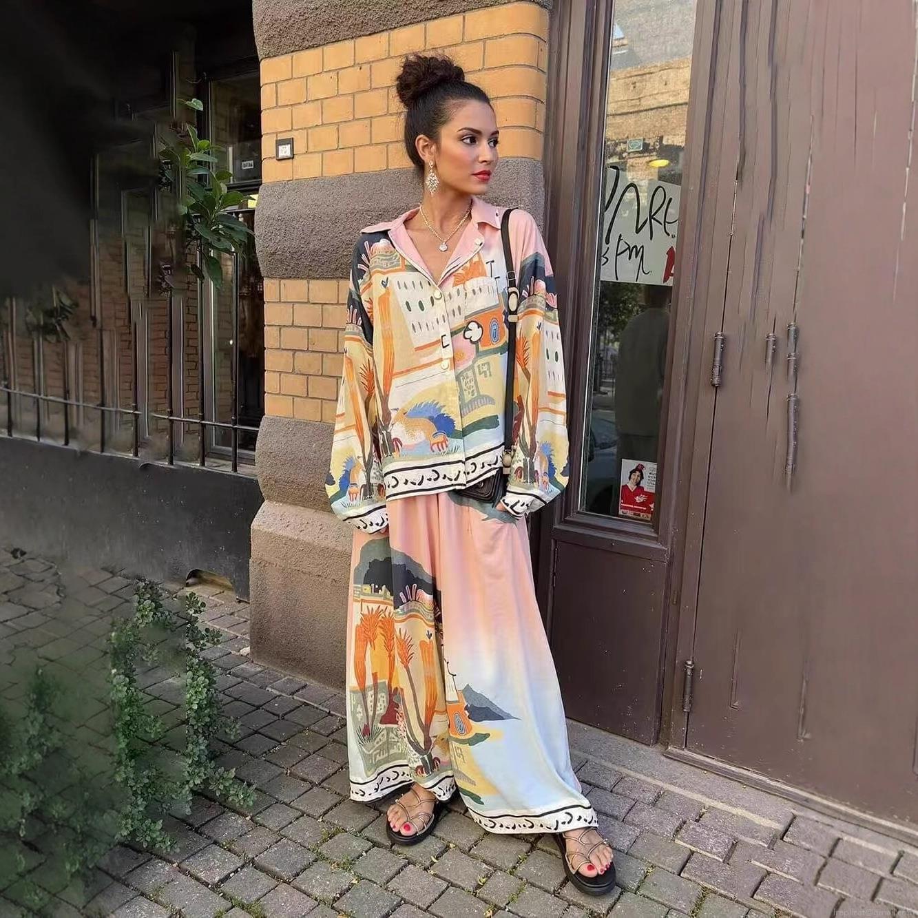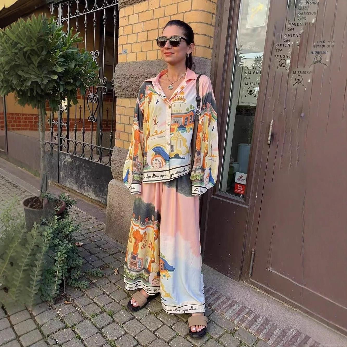• Women's Artistic Landscape Print 2 Piece Set Satin Long Sleeve Lapel Shirt and Elastic Waist Wide Leg Pants Casual Vacation Streetwear Outfit