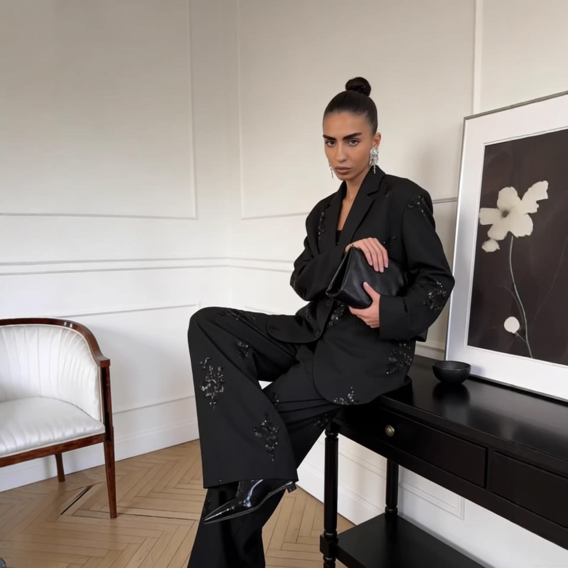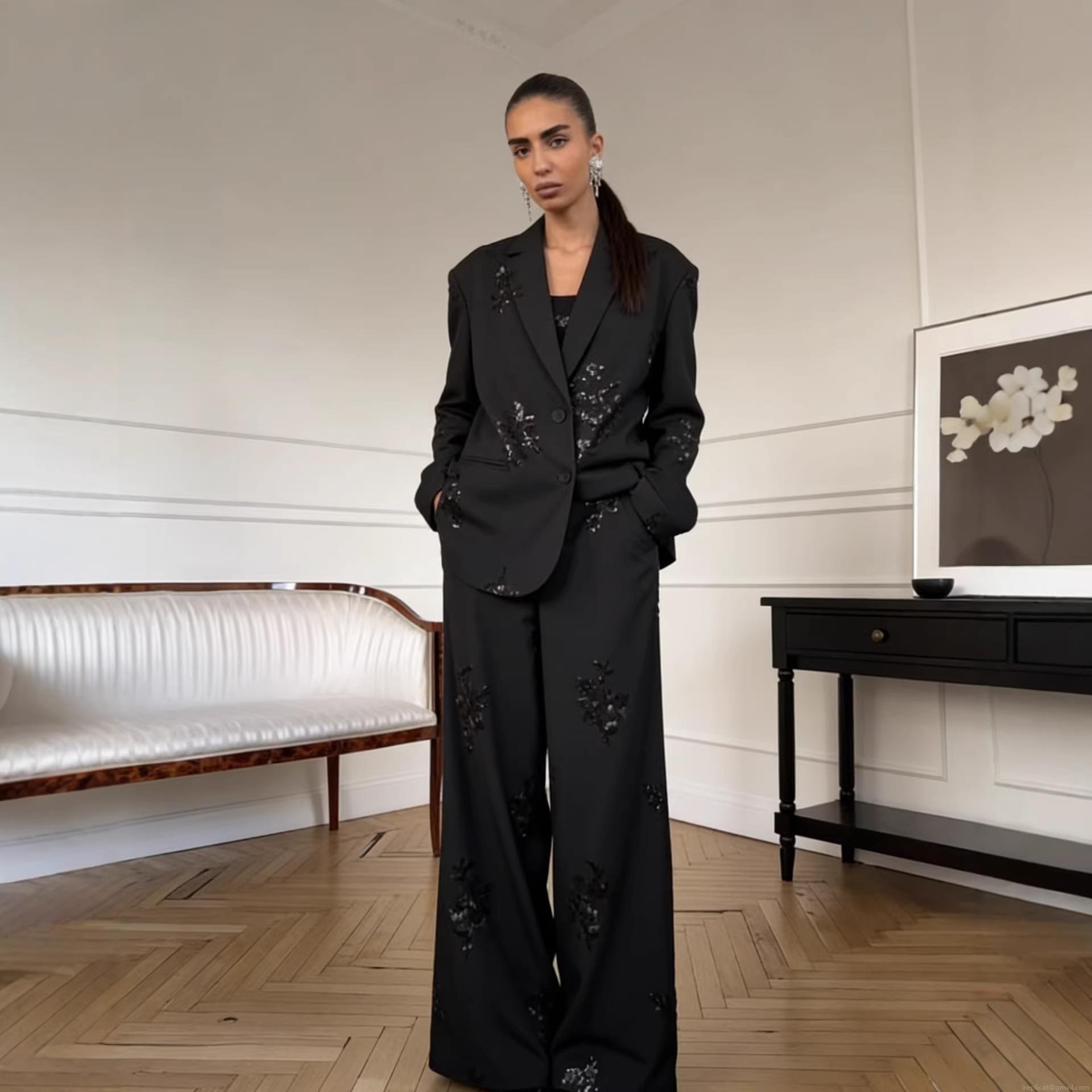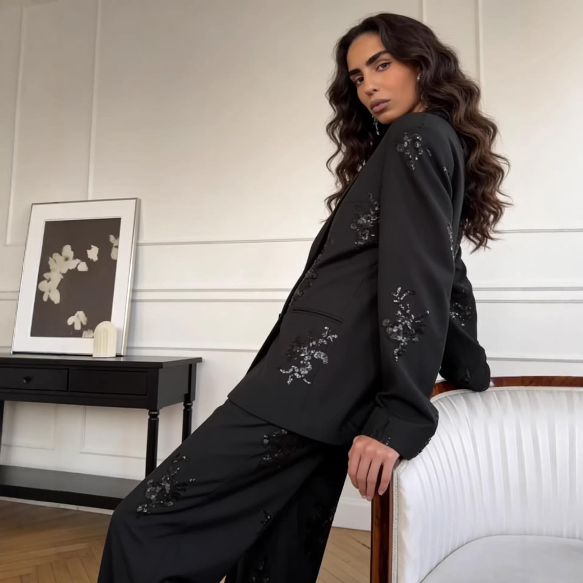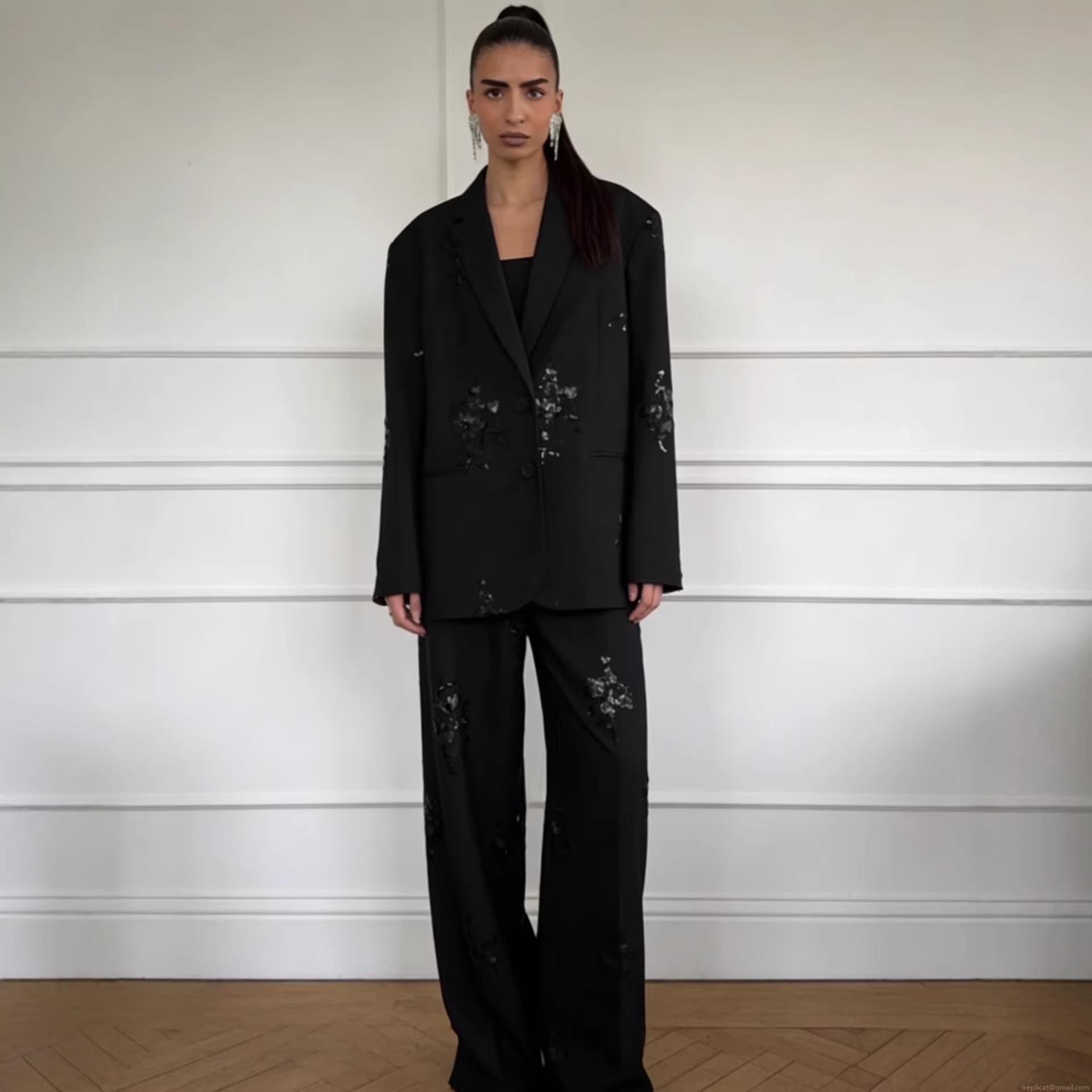• Women's Black Sequin Floral Embroidery Blazer Set 2 Piece Outfits Single Breasted Mid-Length Jacket Wide Leg Pants Elegant Fashion Streetwear Commuter Party Set