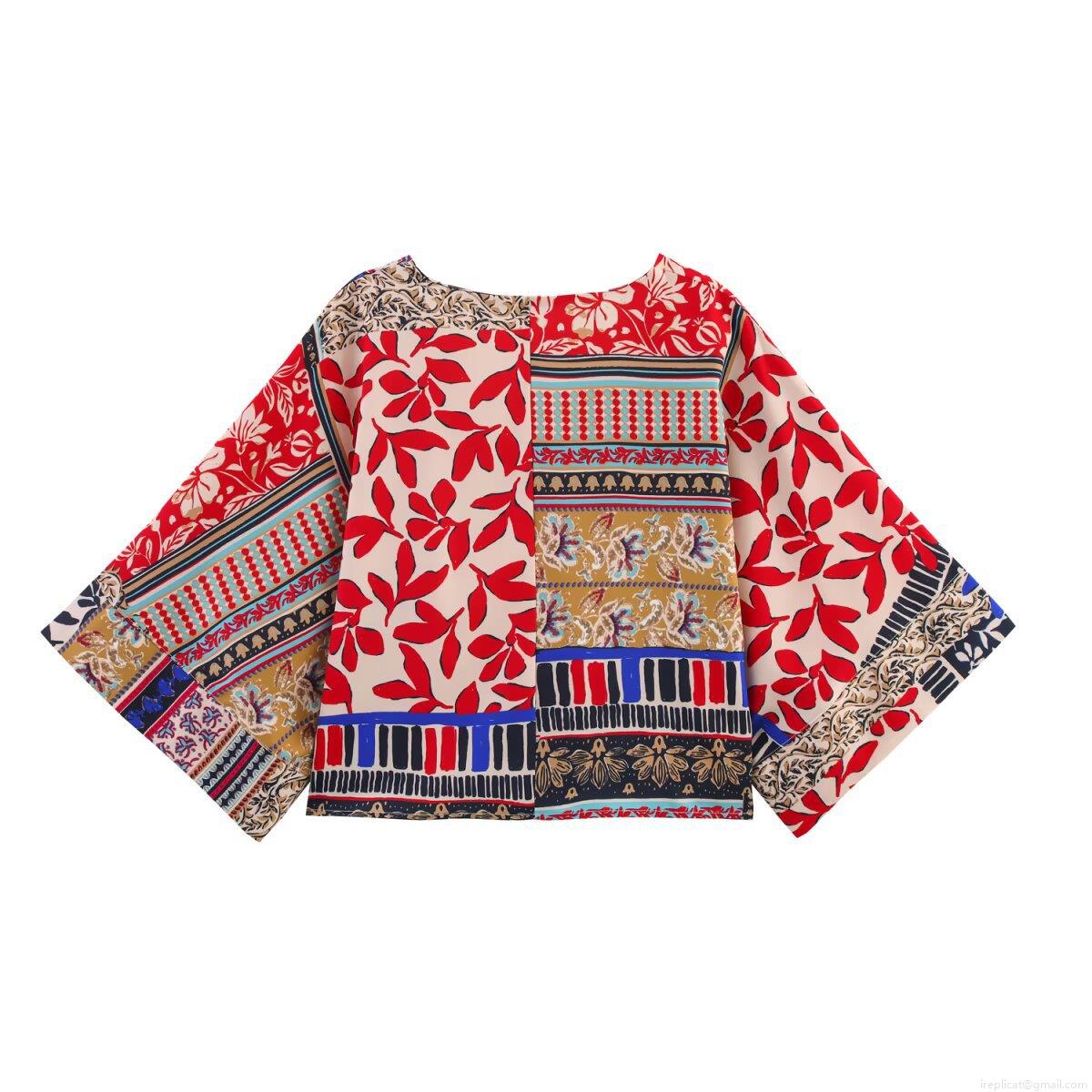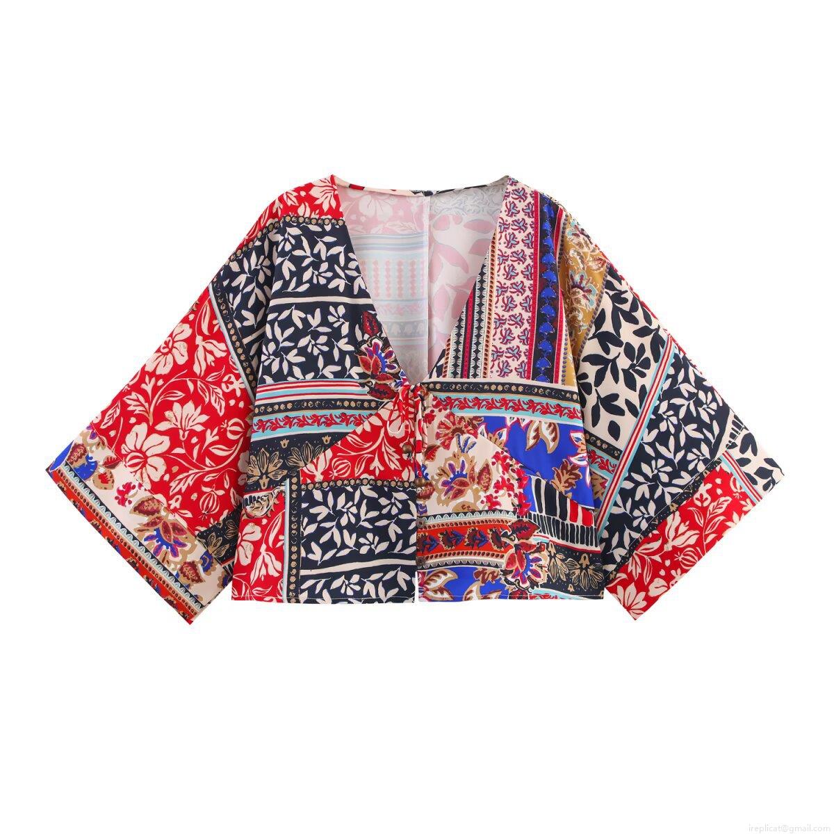 Plants And Flowers, Printing, Patchwork, V-neck, Lace, Wide-leg, Batwing Sleeves, Wooden Beads, Geometric Floral Print
