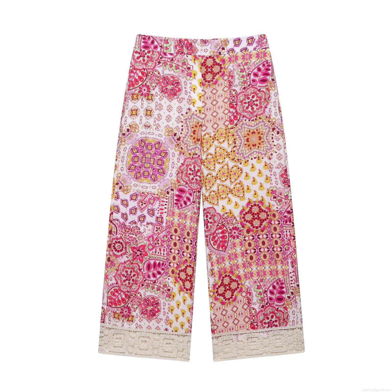 • Women's Bohemian Printed 2-Piece Set V Neck Long Sleeve Lantern Sleeve Shirt and High Waist Wide Leg Pants With Lace Patchwork Ethnic Floral Summer Vacation Outfits
