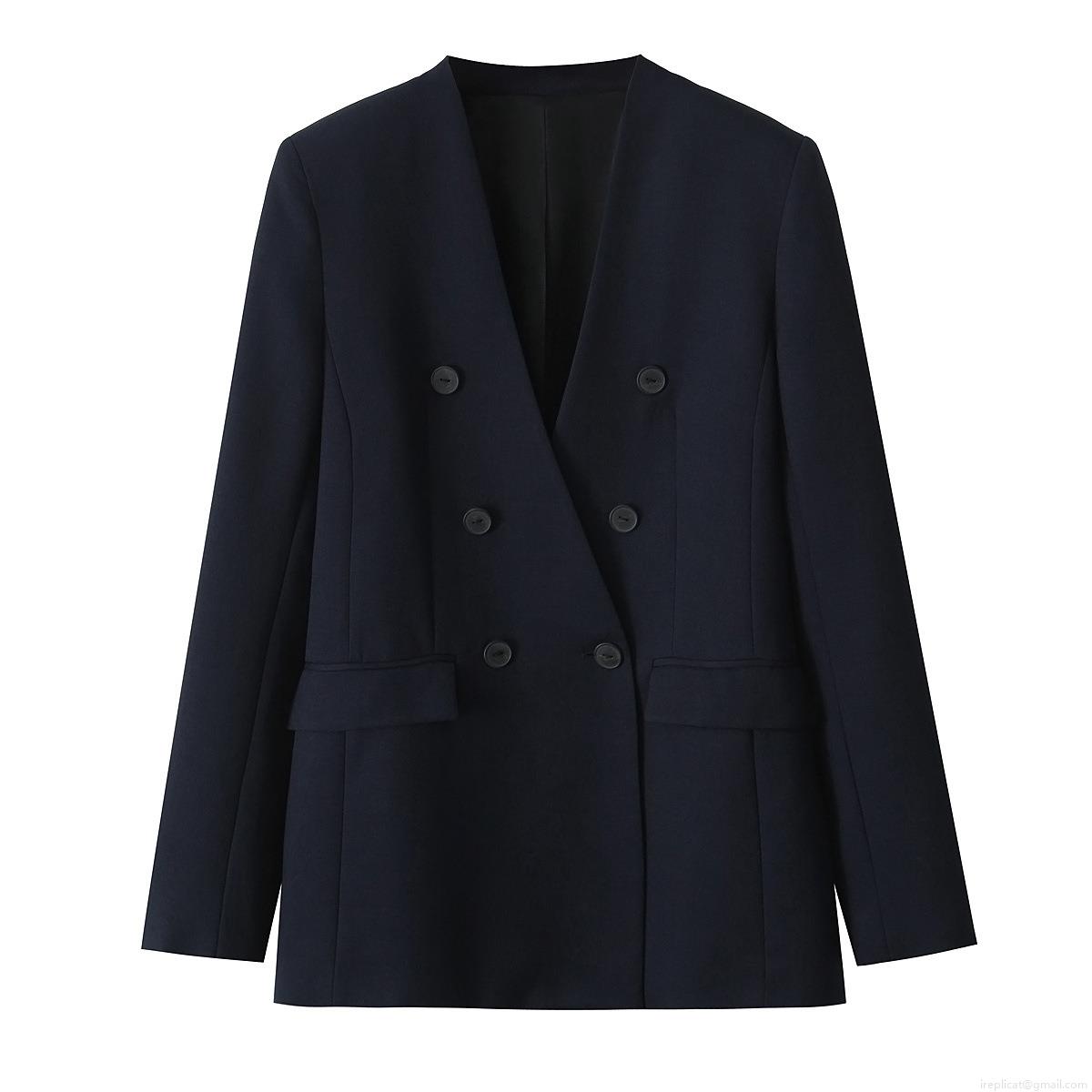 • Women's Business Casual Polyester Suit Set Navy Blue Double Breasted V-Neck Blazer And Straight Leg Trousers Two Piece Set Office Lady Streetwear Autumn Outfits