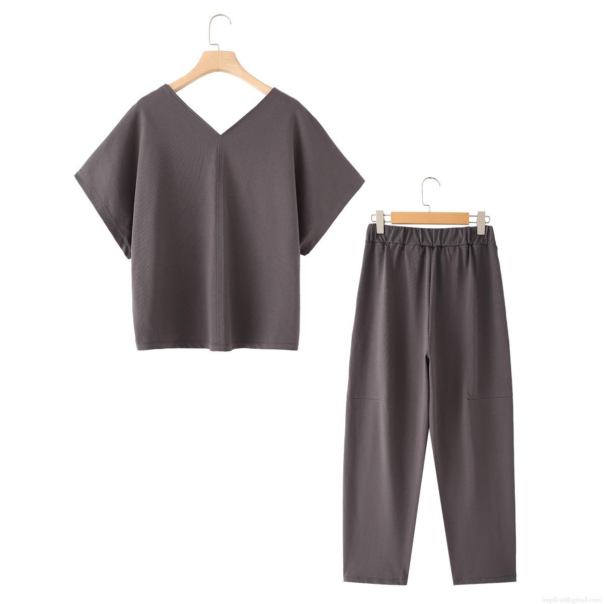 • Women's Casual 100% Cotton 2 Piece Set V Neck Short Sleeve T-Shirt and High Waist Wide Leg Pants with Belt Outfits Loungewear