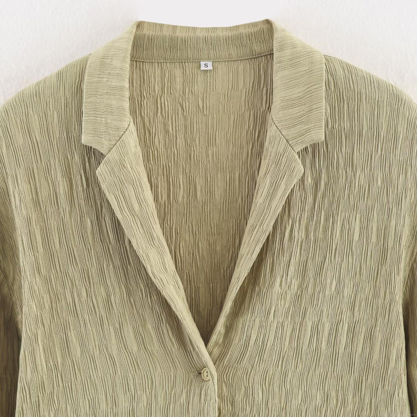 Women's Casual 2-Piece Set Pleated Textured 100% Polyester Long Sleeve Button Down Shirt And Straight Wide Pants Lounge Wear Autumn Fashion