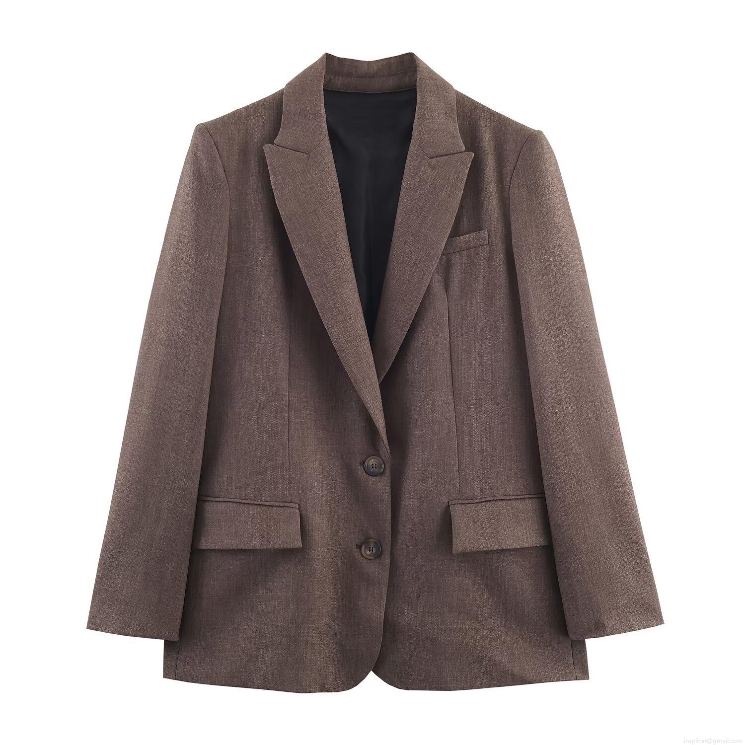 Women's Casual Brown Woven Polyester Blazer and Pants Set Autumn Fashion Streetwear Two-Piece Suit with Back Button Detail for Women Office Ladies