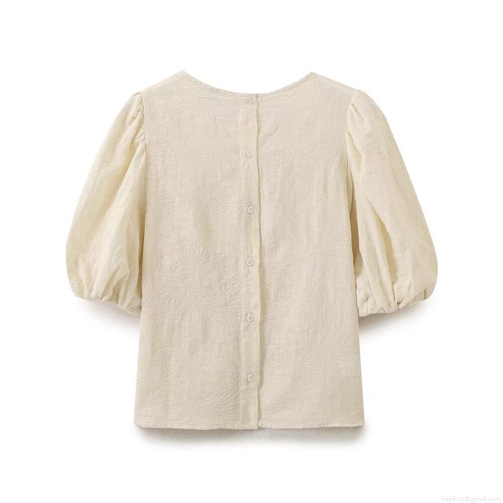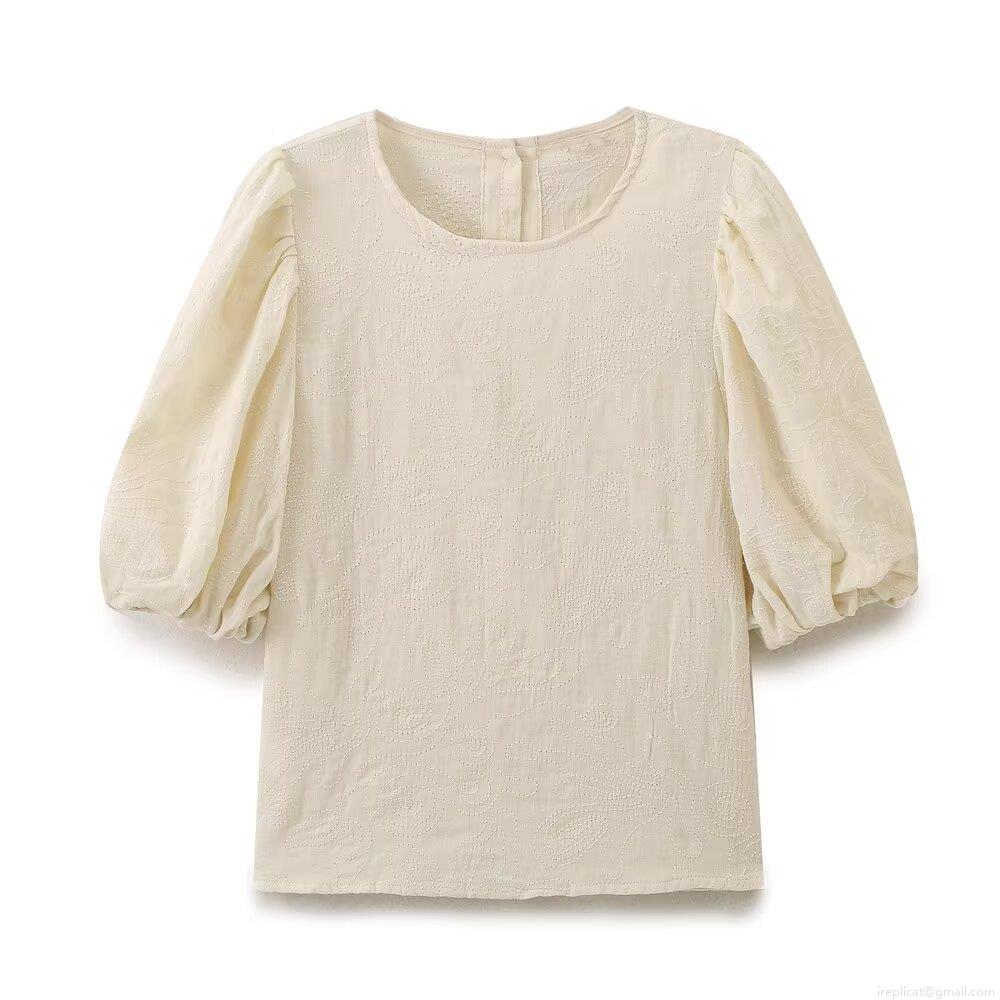• Women's Casual Cotton Blend Embroidery Two Piece Set Puff Sleeve Round Neck Top And Wide Leg Pants Suit Elegant Summer Outfit Streetwear Beige