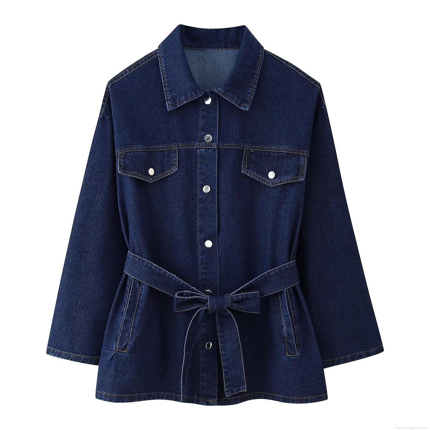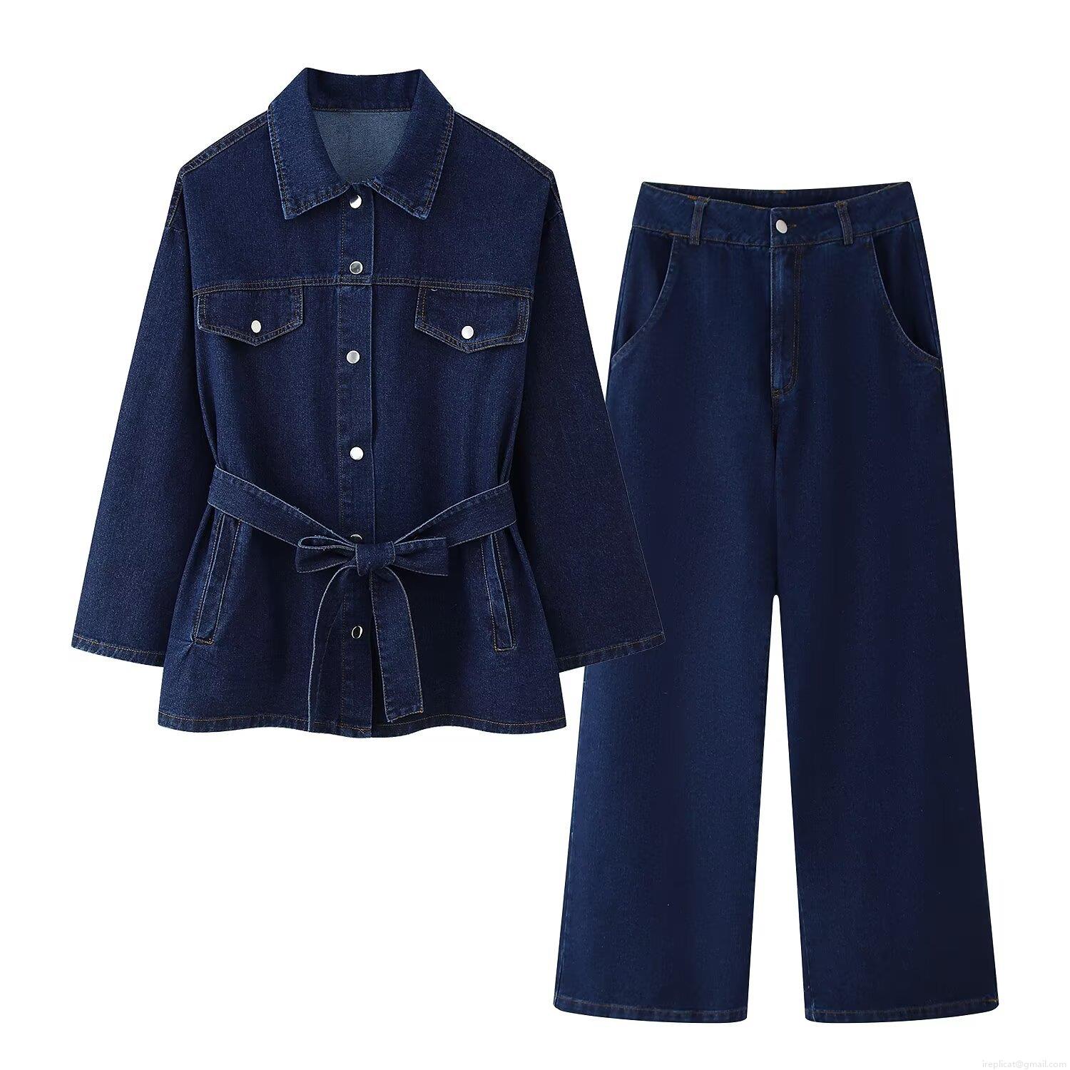 • Women's Casual Denim 2 Piece Set Lapel Long Sleeve Belted Jacket And High Waist Wide Leg Jeans Solid Color Streetwear Outfits For Women