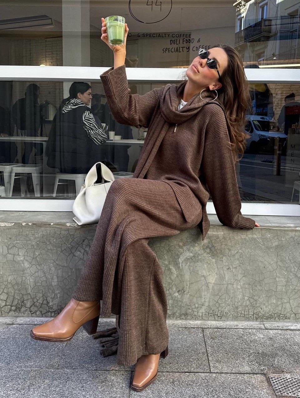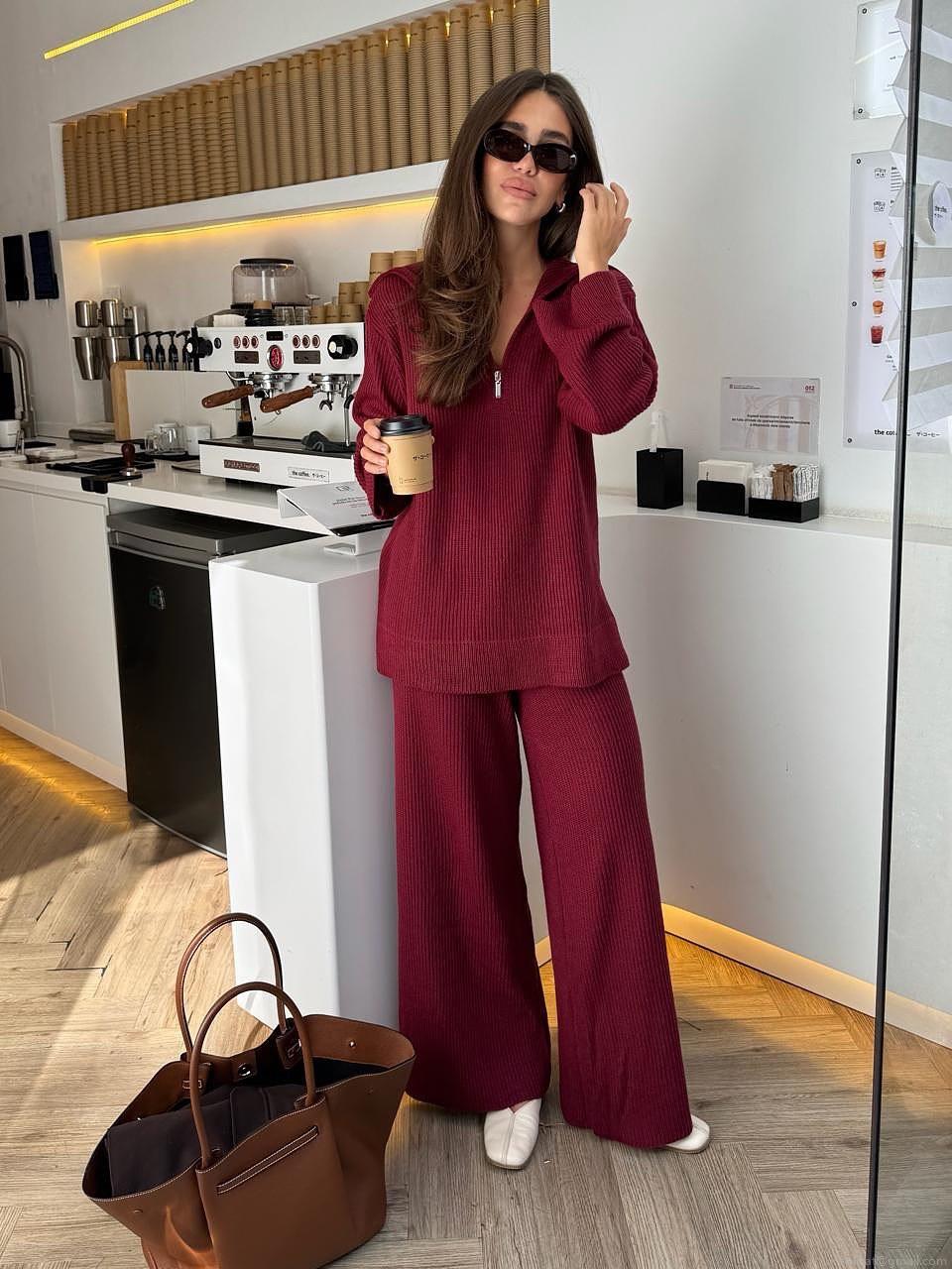 • Women's Casual Knit Two Piece Set Half Zip Long Sleeve Sweater and High Waist Wide Leg Pants Autumn Winter Warm Cotton Blend Tracksuit Loose Fit