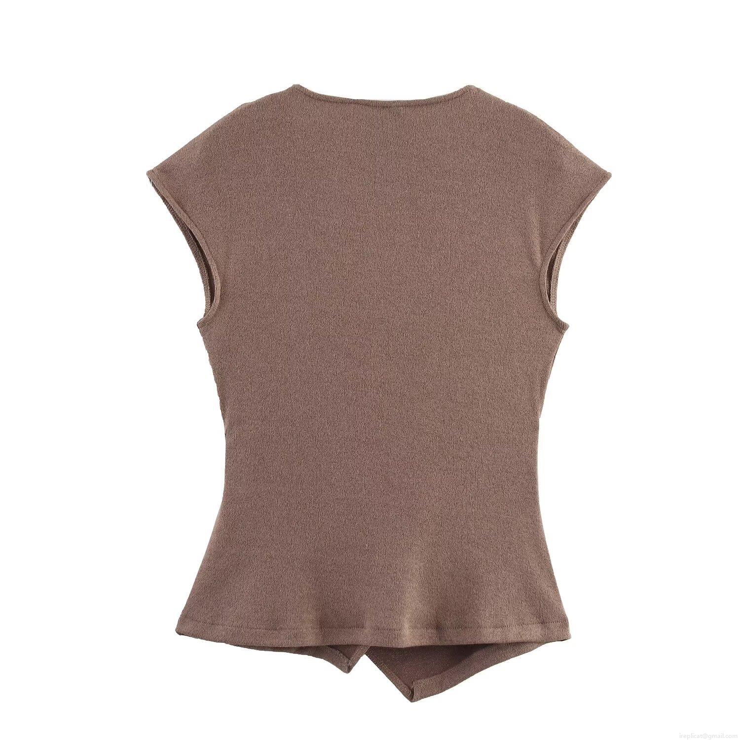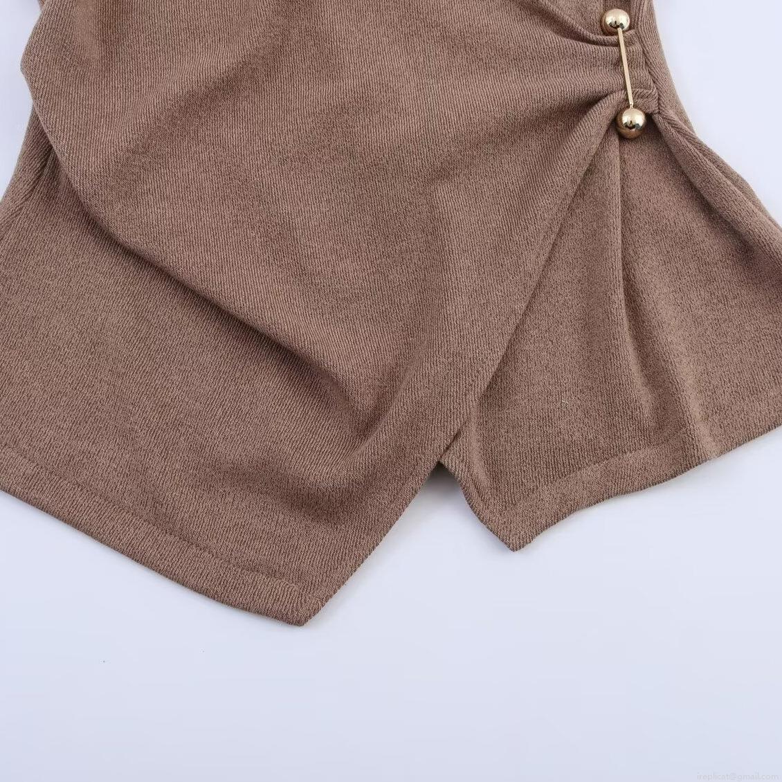 • Women's Casual Knitted Two Piece Sets Sleeveless V-Neck Asymmetric Top and High Waist Wide Leg Pants Set Solid Color Lounge Wear With Metal Pin Decoration