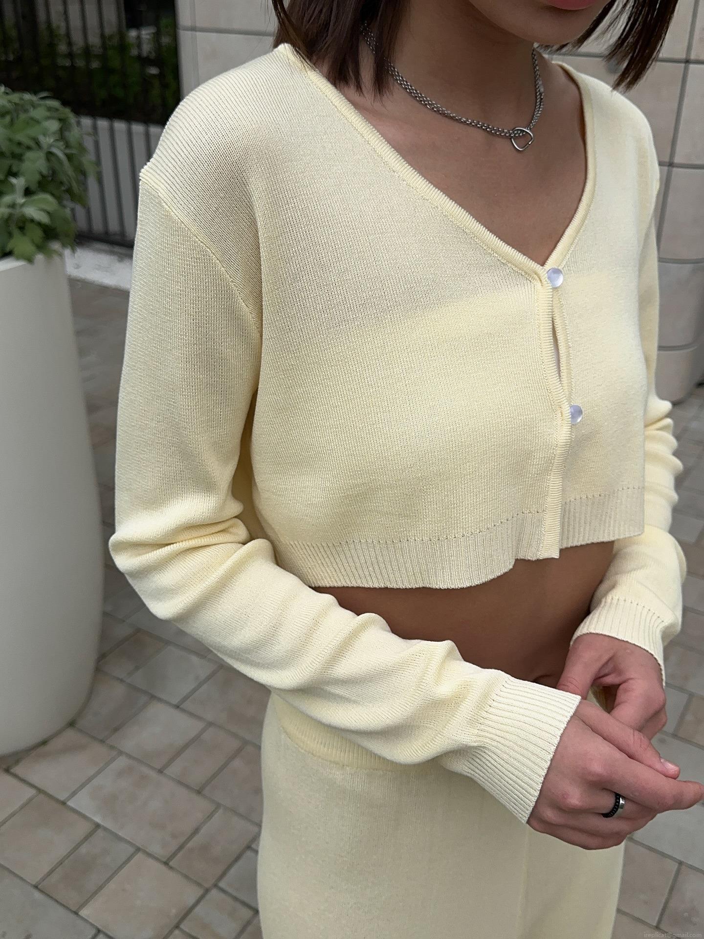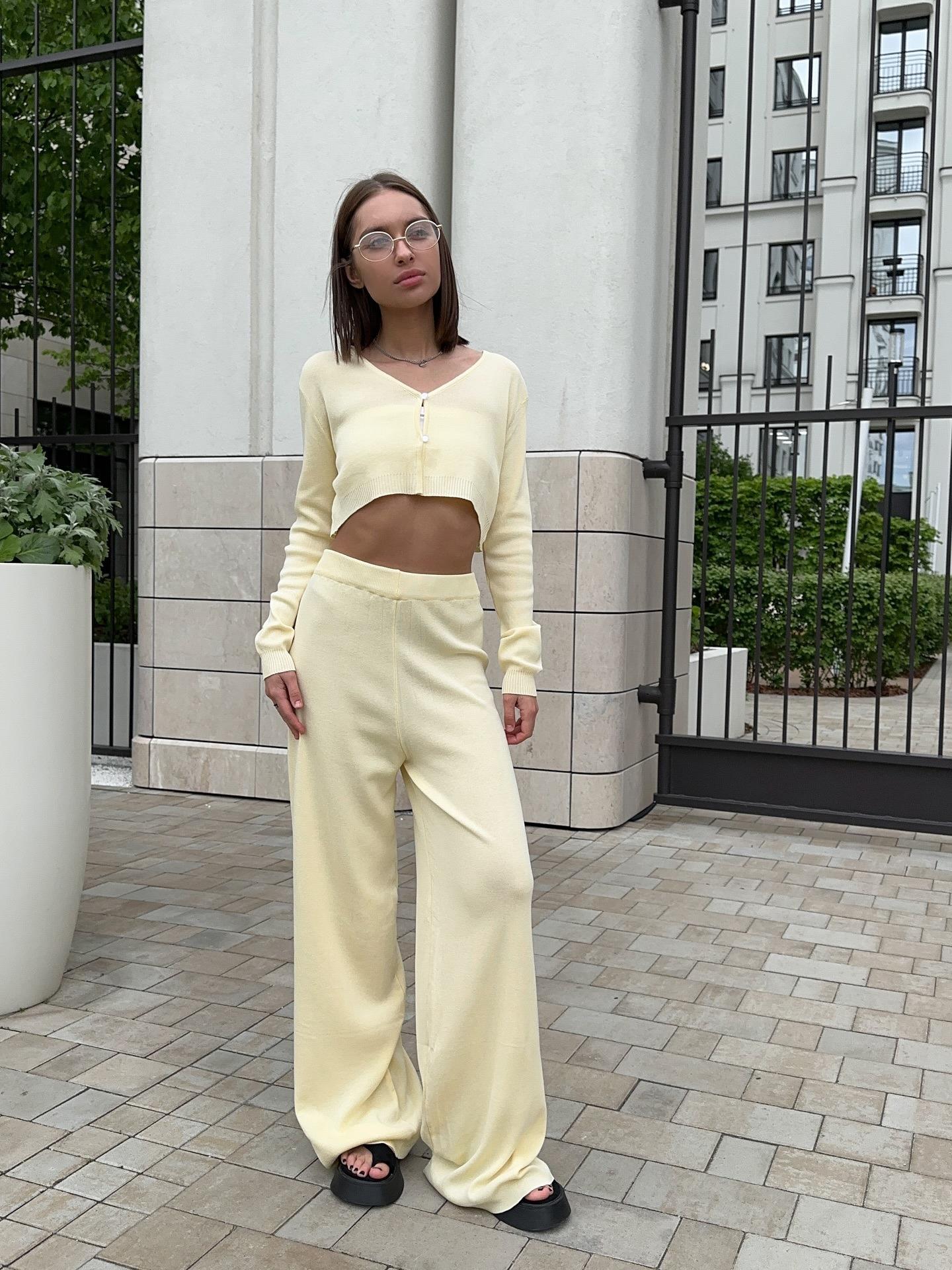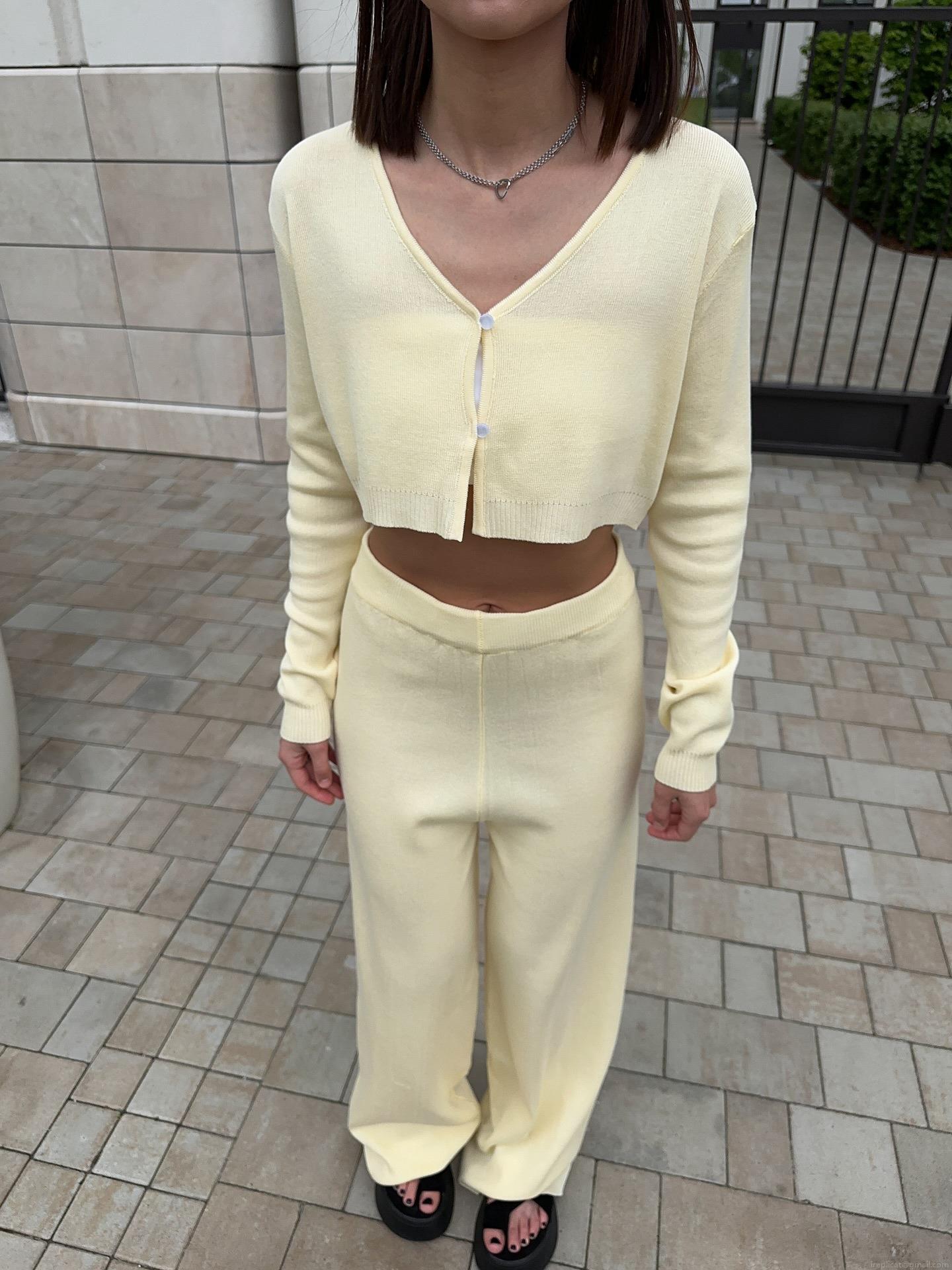 • Women's Casual Knitted Two-Piece Set V-Neck Short Button Cardigan And High Waist Wide Leg Pants Solid Color Cotton Polyester Blend Long Sleeve Lounge Outfit