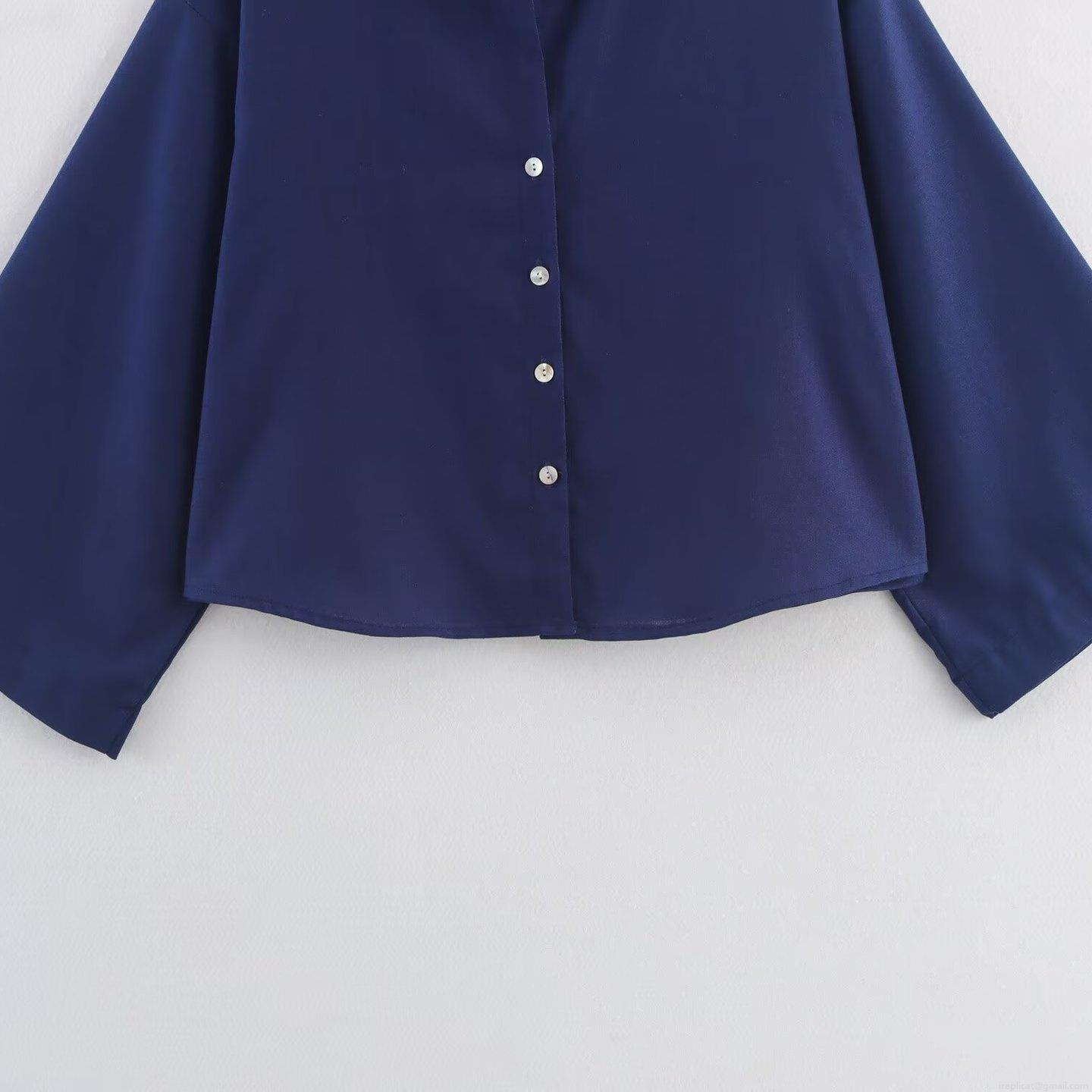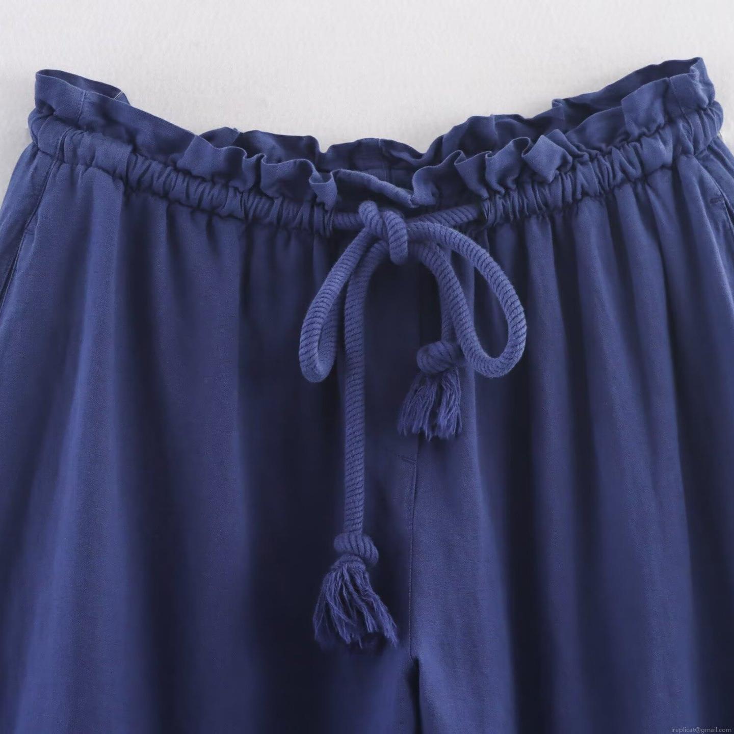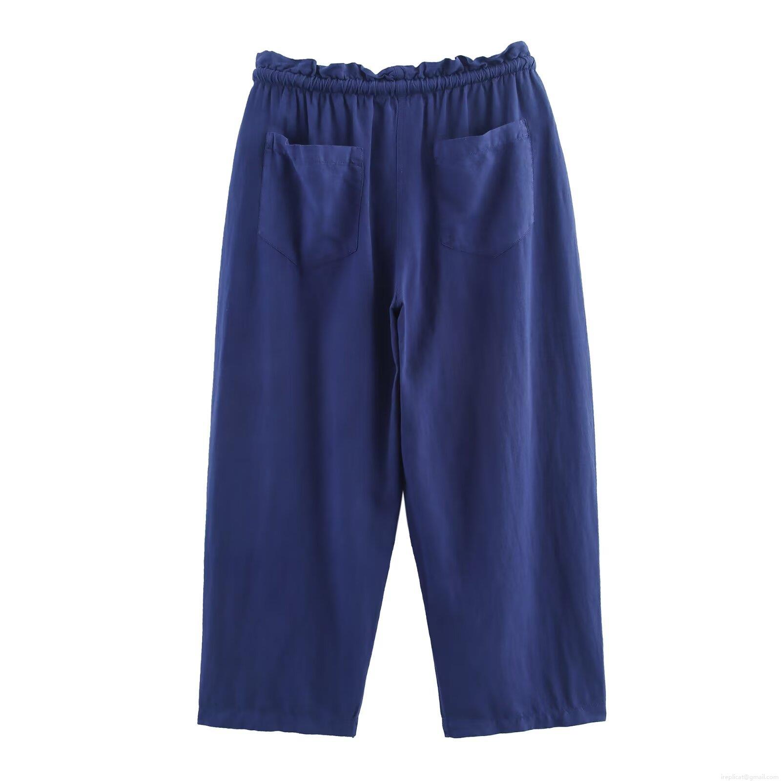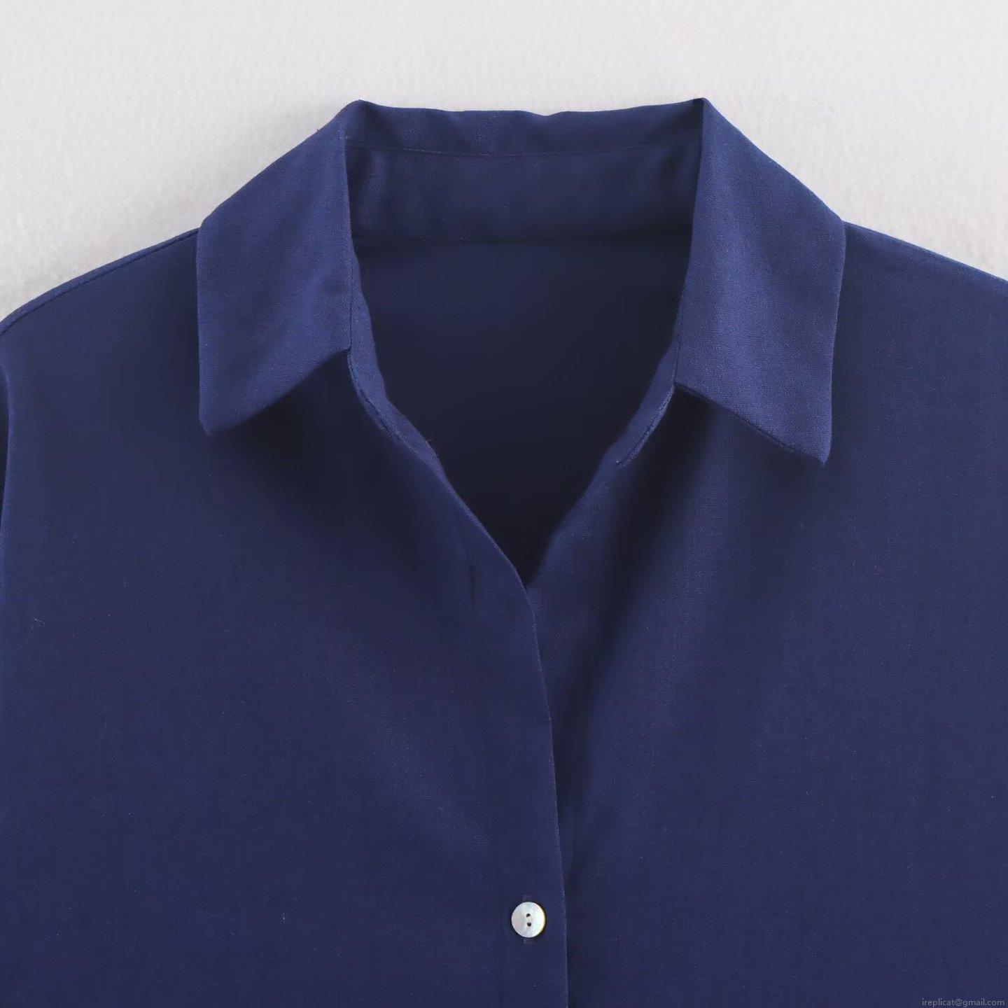 • Women's Casual Linen Blend Two Piece Set Navy Blue Lapel Button Down Shirt And Elastic Waist Wide Leg Cropped Pants Loungewear Outfit