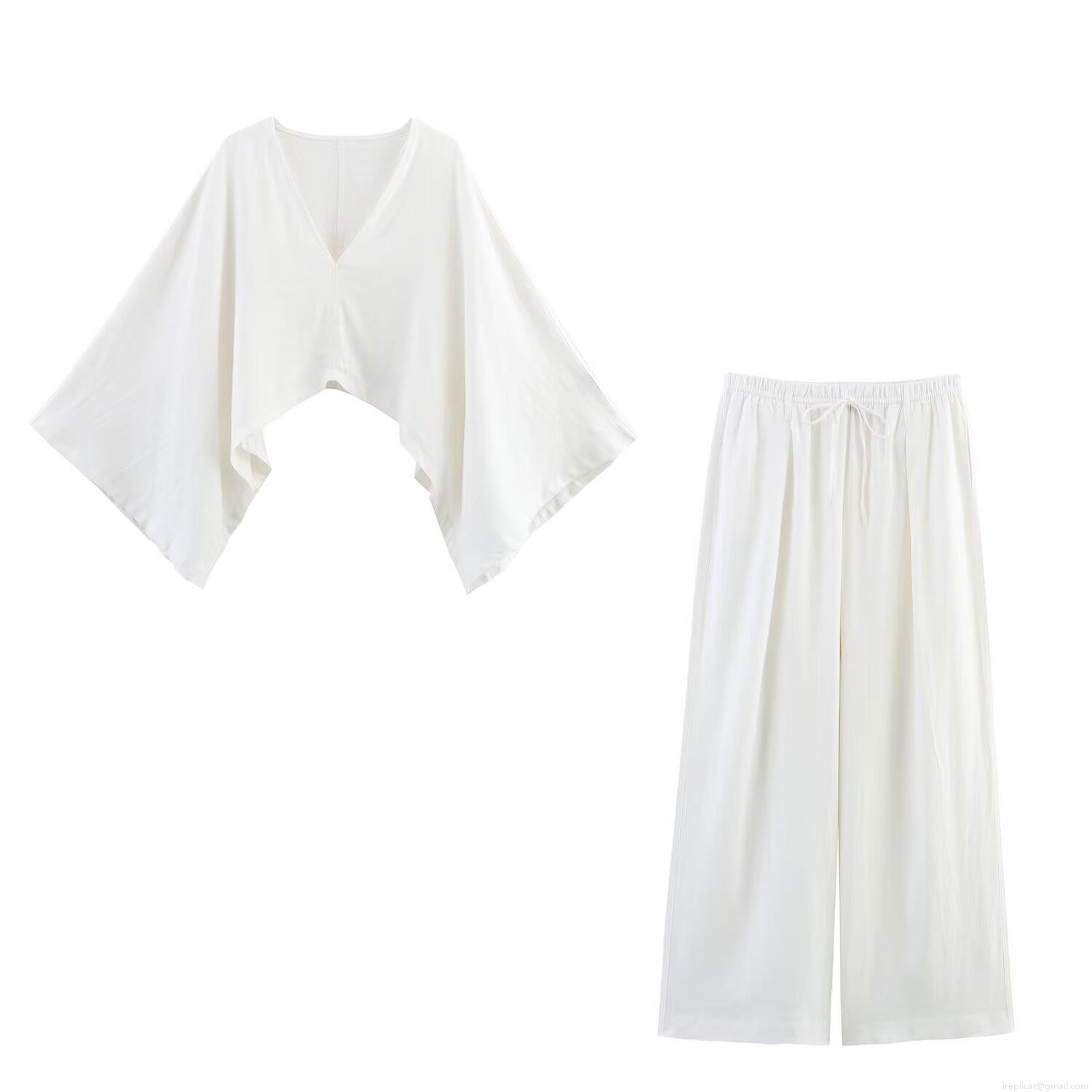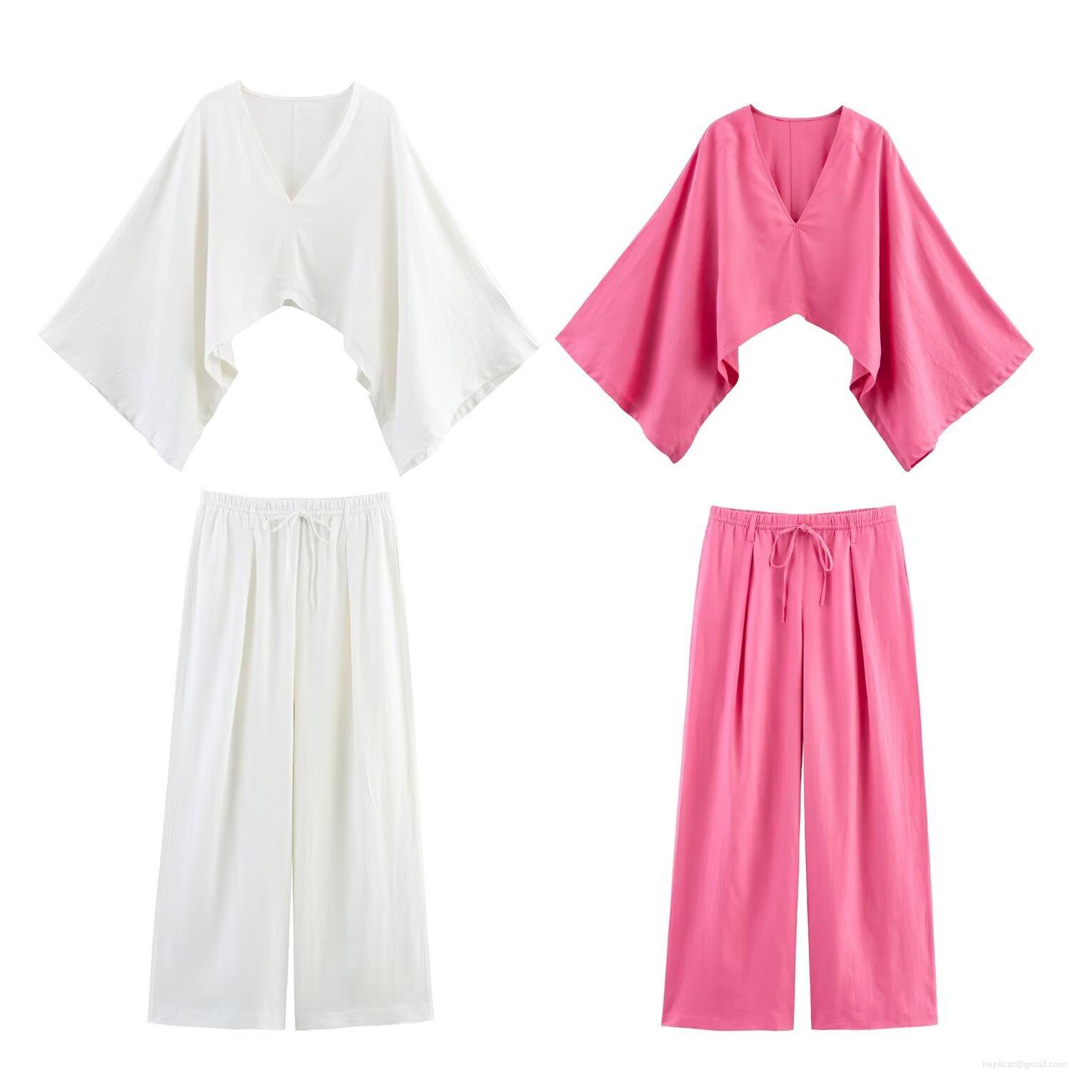 • Women's Casual Linen Two Piece Set Asymmetrical V Neck Bell Sleeve Crop Top And Drawstring High Waist Wide Leg Pants Solid Color Outfits