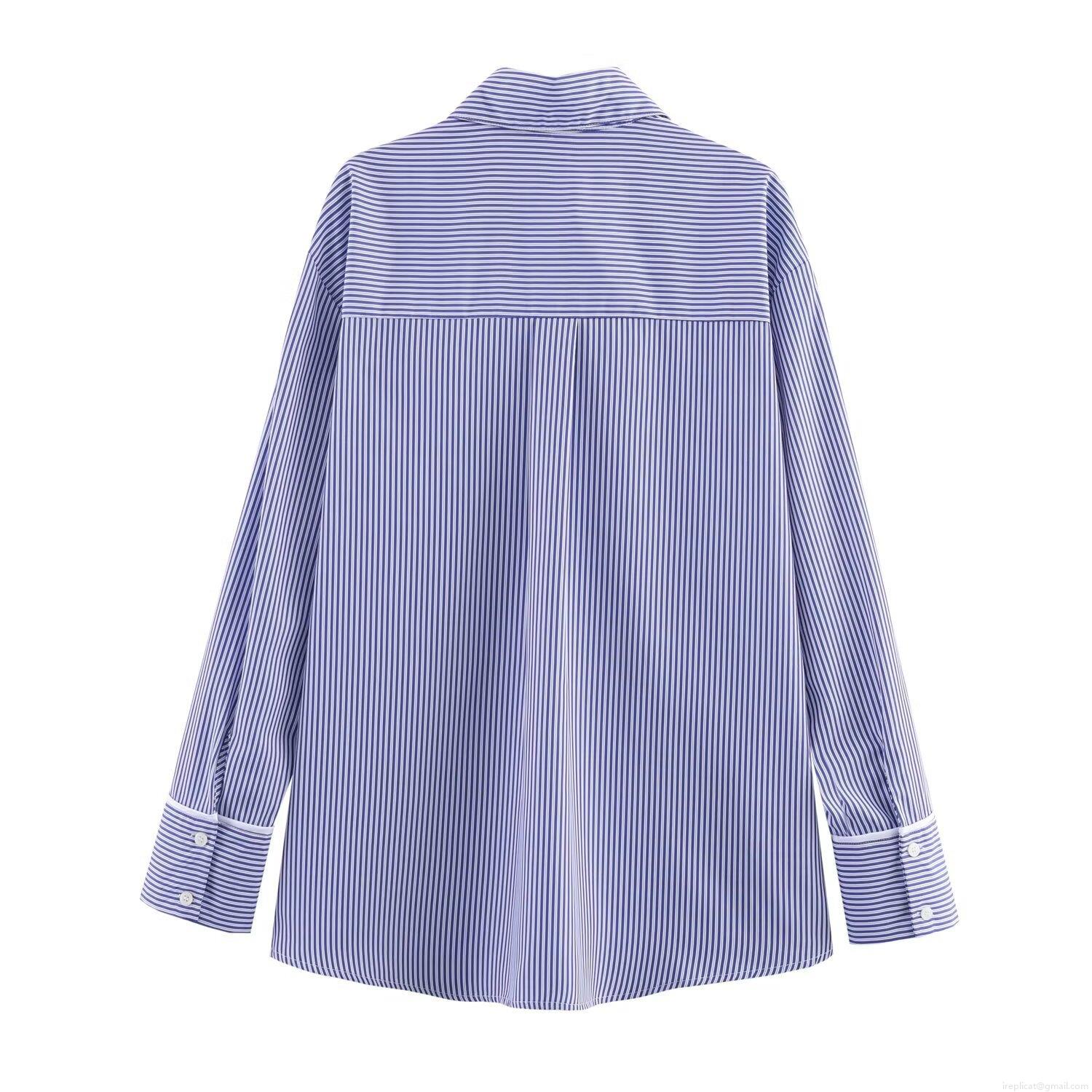 • Women's Casual Poplin Contrast Stripe Pajama Style Set Long Sleeve Button Down Shirt And Wide Leg Pants Set Blue Purple White Stripe Loungewear Streetwear